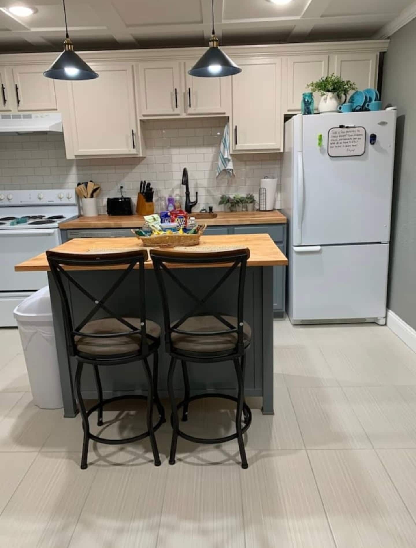 The kitchen features a toaster oven, pizza maker, single counter top burner, gas grill