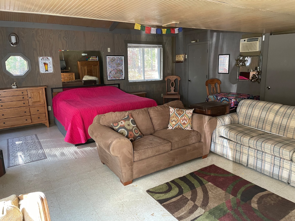 The cabin is a guest house with full kitchen and full bath on the first floor. The second floor houses a queen bed with pillow top and a half bath. The waterfall sounds lull you into relaxation. The spa/massage studio on the first floor is available for booking treatments during your stay, otherwise locked. Pictures show a full futon in the spa studio which is not accessible to guests. You can also further relax in the outdoor hot tub during your visit, with evening hours ending at 10PM.