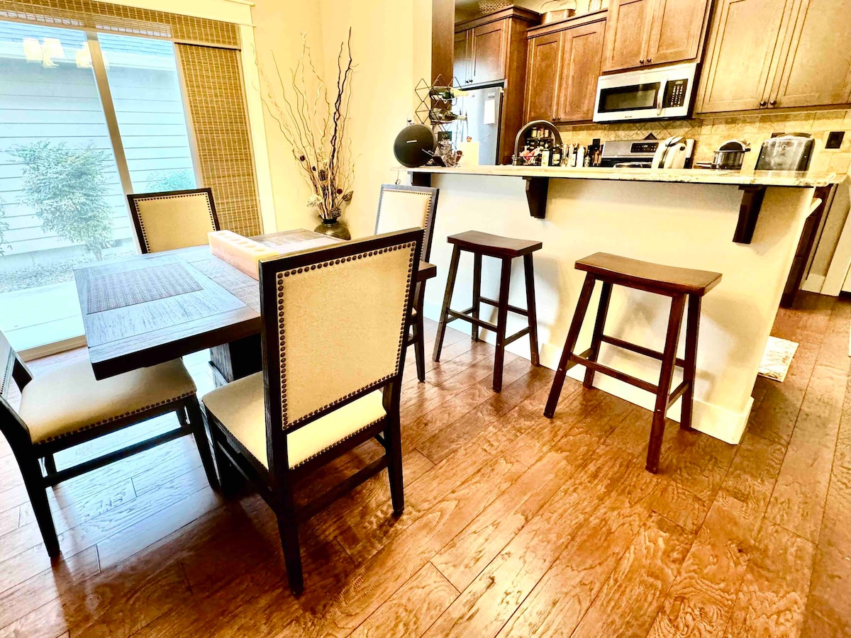 Quiet and clean fully furnished room includes a queen sized bed and full-sized bath. Carpeted bedrooms and full bathrooms are located upstairs. The fully furnished shared space downstairs offers beautiful dark hickory hardwood floors, gas fire place, full kitchen with newer appliances, washer and dryer and a half bath for guests.