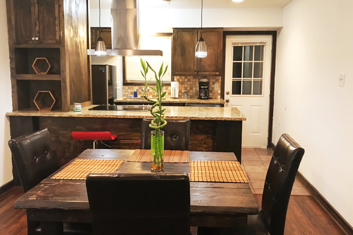 Private Unit includes living room, dining room, full kitchen (refrigerator, microwave, oven, electric stove, pots, pans, and utensils), full bathroom (shower/tub), and lux bedroom (queen bed).