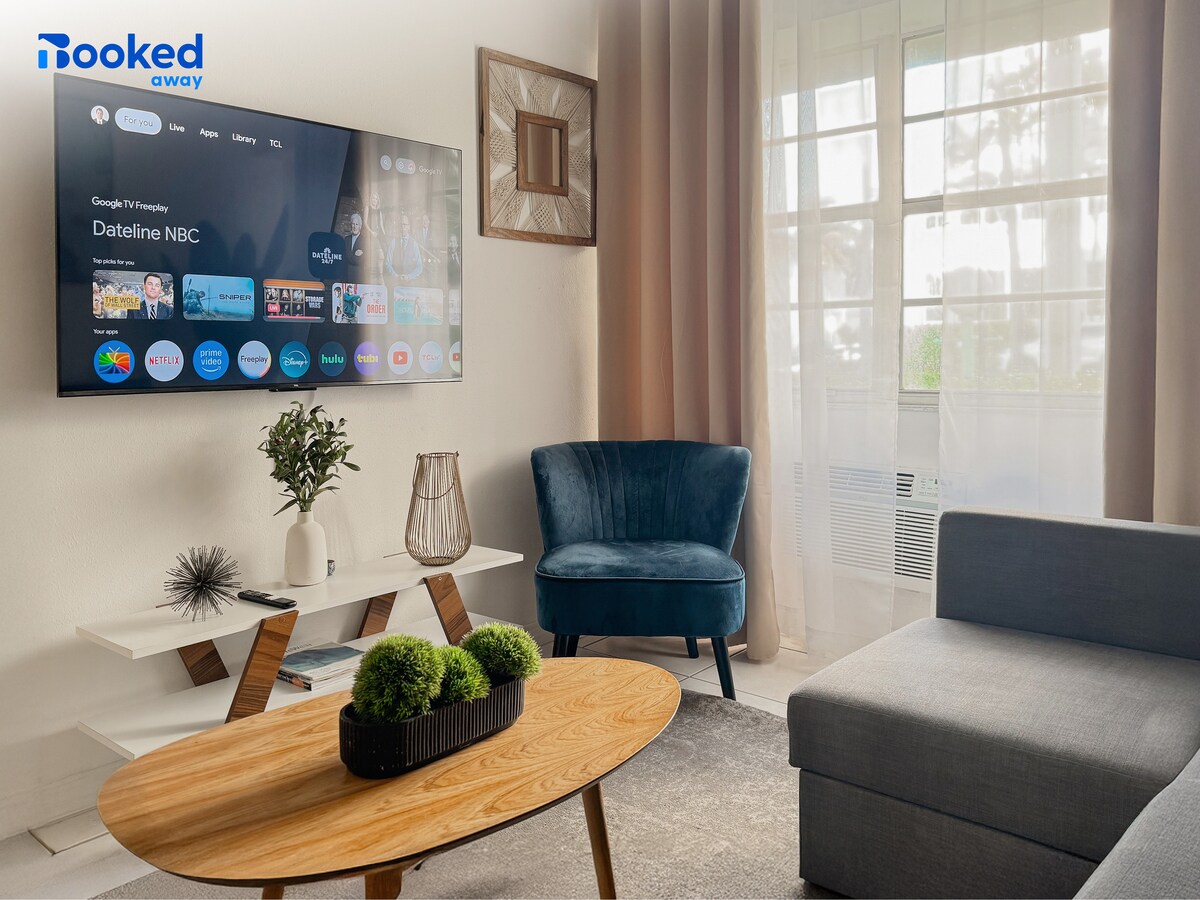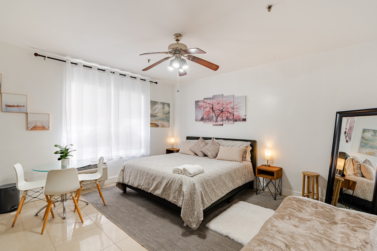 This immaculately clean studio flooded with natural light from large windows in a vibrant Miami Beach neighborhood. Pristine white walls and crisp linens reflect the abundant daylight, making the space feel peaceful and remarkably open and airy. Perfect retreat after a long day of exploring.