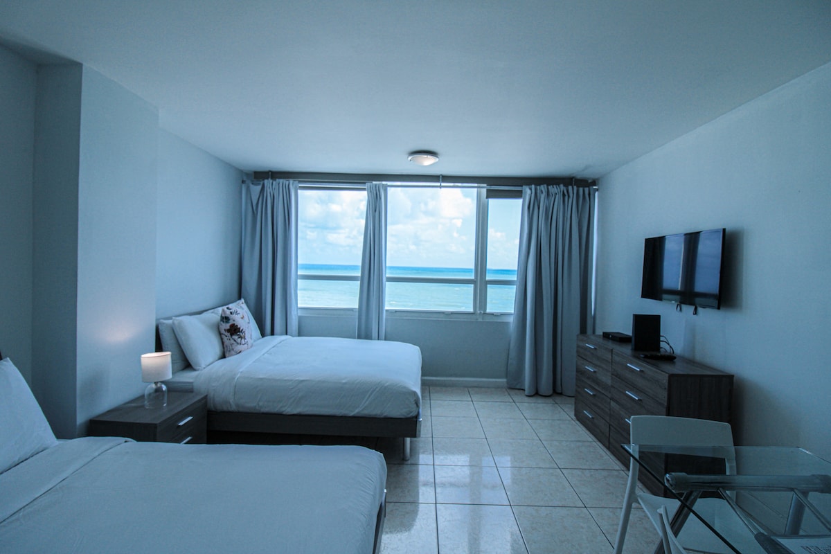 Eleventh-floor studio with views of Miami Beach Bay and the Intracoastal. Sleeps 4 with two queen beds, bathroom, and kitchenette. Free valet parking. Building amenities include a restaurant, two coffee shops, a pool, supermarket, tennis, beach access, and a modern washer-dryer room on the lower lobby. Your Miami stay simplified. This property is pet friendly 25Lb max, contact us for pet security deposit ($150)