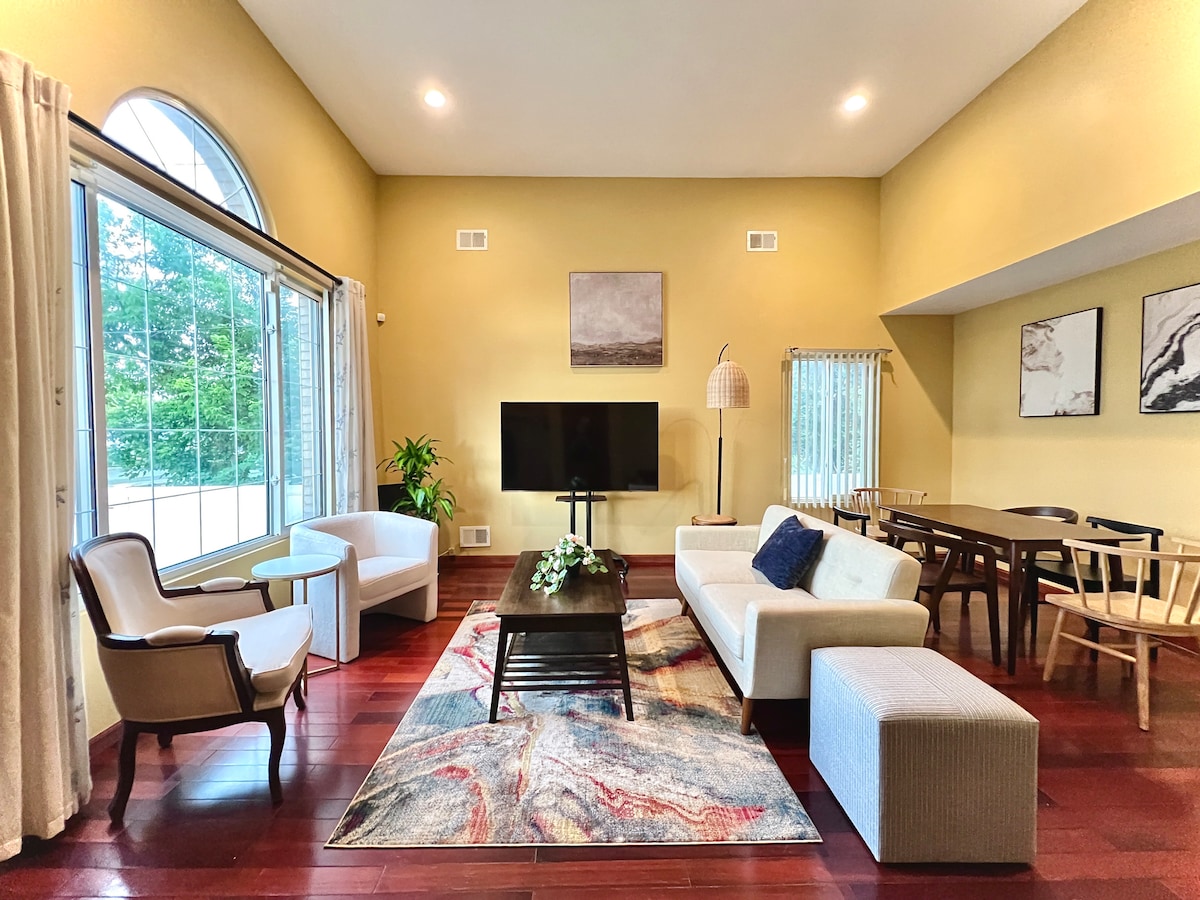Enjoy the entire space, complete with a full kitchen, laundry facilities, fast Wi-Fi, and free parking. With 15ft high ceilings living & dining room, the bedrooms are thoughtfully situated on separate floors, ensuring optimal privacy.