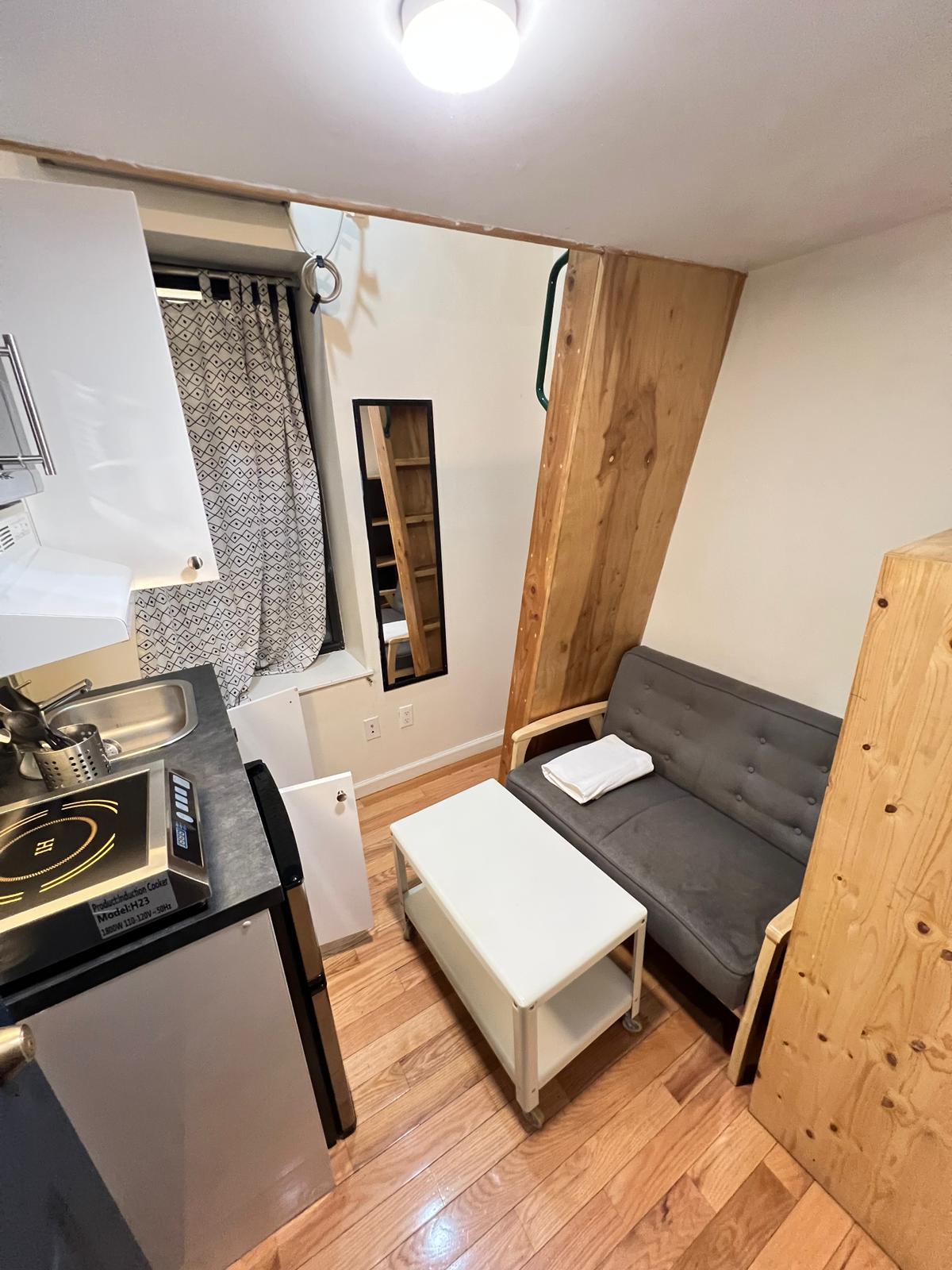 Lofted private studio with shared bathroom in an excellent, clean, safe Chelsea building with laundry in basement.