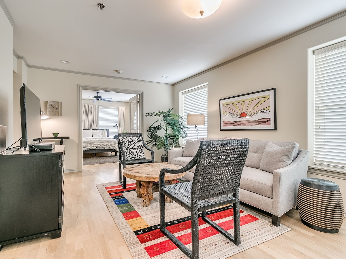 Enjoy your time in Oklahoma City's Vibrant Midtown District in our deluxe studio apartment at The Shay. This unit is located on the 3rd Floor. The Studio is 400SF and has a large king size bed while the living room has a fold out sofa which can sleep an additional guest (*for a child or small adult, check out our Suites w/pullout sofa bed better suited for additional guests). The kitchen is fully equipped with a coffee maker, silverware, utensils, range/oven, microwave, fridge and all essentials needed for cooking. The living space has a 55 inch Smart TV for you to login to your favorite streaming apps. We offer contactless check in, upon booking the door code will be programmed and sent to you in the Welcome Email, so you can check in at your convenience. The Shay has been recently remodeled in contemporary style with all of the amenities you would need for your stay at The Shay.