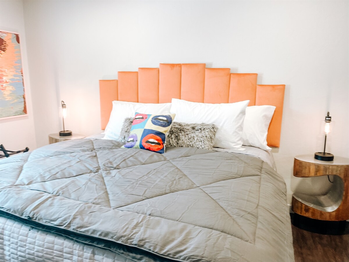 Valerie is a local art teacher and her eclectic style shows through in her space - her students artwork is hung in the living room along with some of her own pieces and other OKC artists’. Beautiful heirloom furniture from her family mixed with contemporary style looks like it comes straight out of a design magazine! Vaulted ceilings and an open floor plan makes this a great home to hang out and watch tv after a long day out on the town, cook a hearty meal, or hang out in the dining room and play some games!