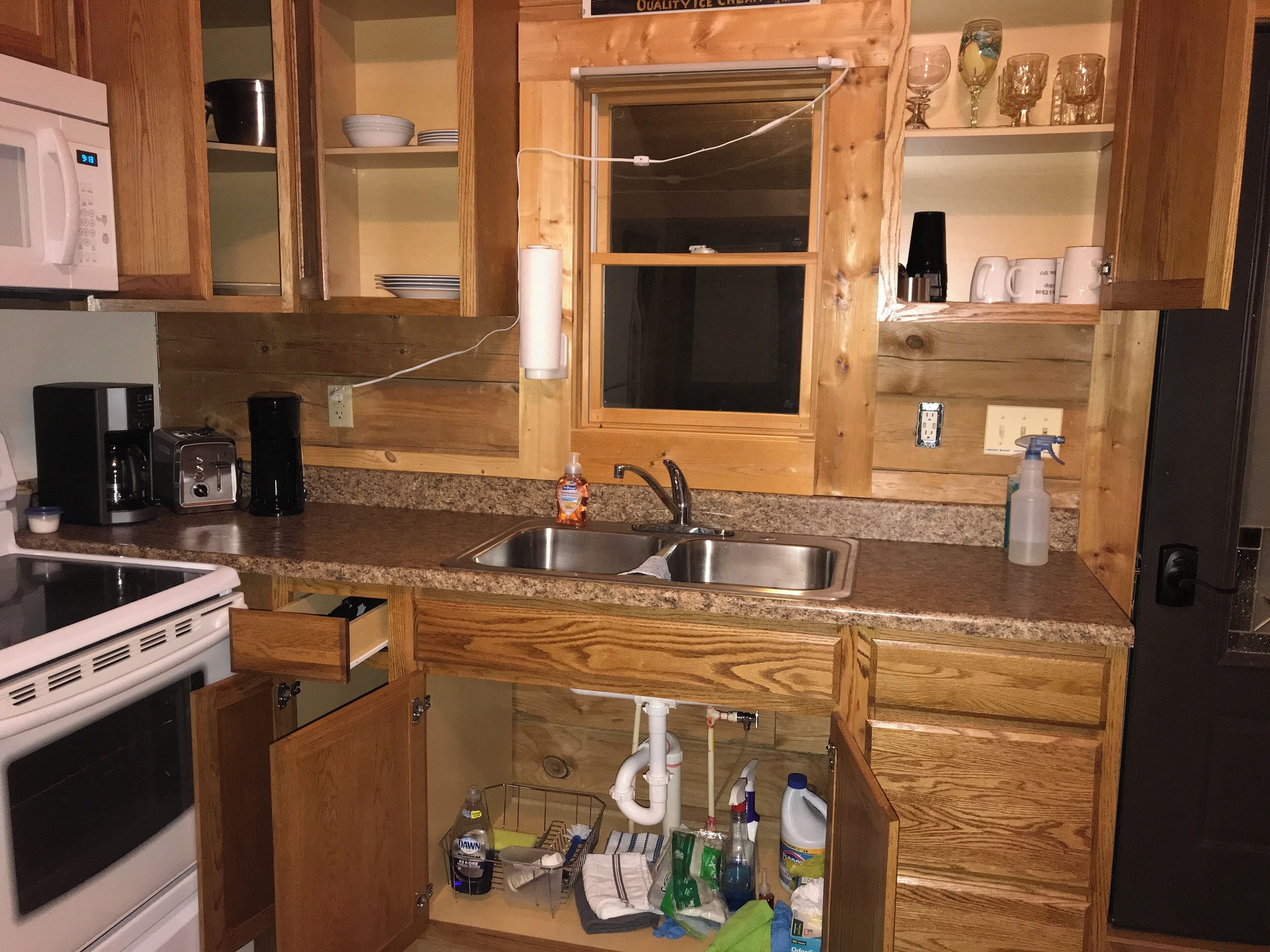 Fully equipped kitchen with stove, refrigerator, microwave and dishwasher. Plenty of other small appliances provided including a coffee maker, a toaster, a crockpot, a gridle, and more.