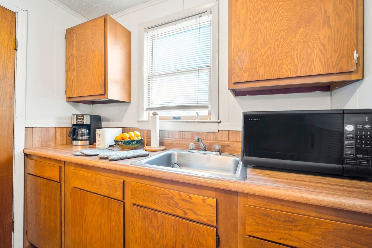 Living room and kitchen is in one area. Deck on the back of the house overlooking a small creek there is a front porch area is very close to Watoga State Park Wi-Fi is available AC and heat in a wall unit with remote or you can do it manually there is a closet in the bedroom for luggage and for hanging clothes there is a dresser for clothes has extra pillows and blankets underneath the bed drawers and the wardrobe drawers. There is a space heater on wheels that you can move around in different areas if need be. There are also small appliances underneath the cabinet where the TV is is a mixer,toaster there’s a blender next to the microwave. There is a full size coffee pot. The cushions for the outside patio are behind the couch be aware there are nearby cats that may lay on them or urinate on them so be best to bring cushions back in at night