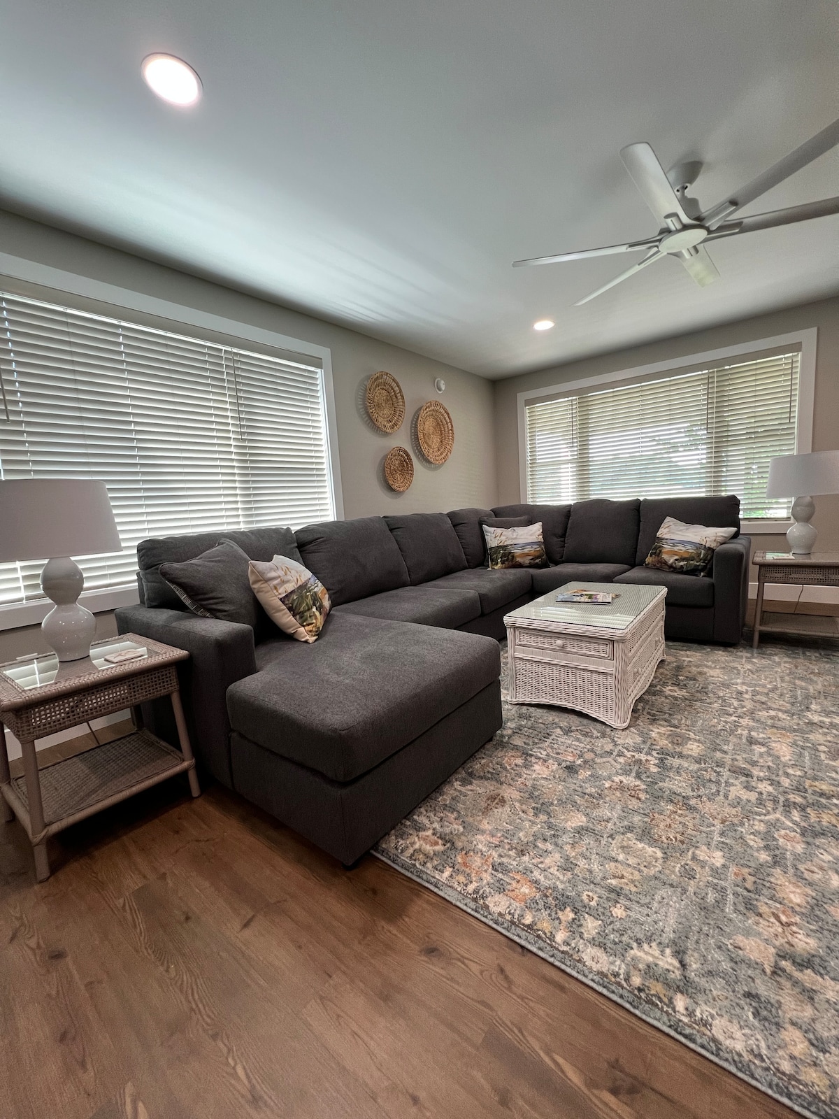 The nautical theme continues inside this fully furnished 3 bed, 1.5 bath home (plus outdoor shower). The bedrooms are spacious and well appointed with luxury mattresses and pillows for a good night’s sleep. Queen-sized beds are in two bedrooms and a twin-over-full bunk bed is in the third bedroom. Each bed has a protective mattress cover. Please do not mistakenly take this home with you when you remove your bedding. A replacement fee will be requested if removed. Ample closet space and dressers are in each room and ready for your personal belongings. 43 inch Samsung Smart TVs are in the living room and in the master bedroom. The master bedroom also has an attached half bath.