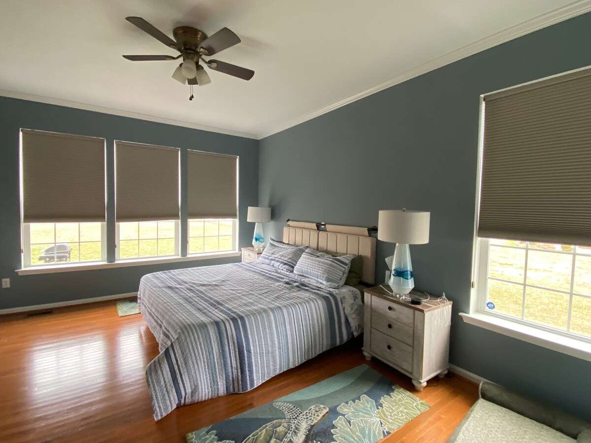 Spacious master bedroom with King bed and bath with closet (one closet is owners). Enjoy soaps, shampoo and conditioner provided by host. Queen bed with spacious closet. Smaller bedroom has trundle daybed ( 2 twin size beds-note: pull out trundle doesn’t “pop-up” to height of other bed and is close to floor) and desk and computer monitor, plus smaller closet. Spacious common area and kitchen. Fantastic and comfy outdoor space with fenced in backyard, patio set, grill. Coffee and tea provided. Towels, sheets, beach towels and mat, beach chairs, umbrellas available.