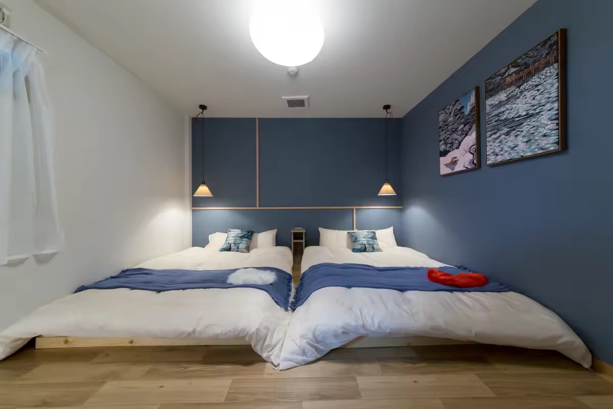 ※ The bedroom has two small double beds of 1.2 meters, the living room has a small double bed and a sofa bed, the living room will not appear crowded, there is still enough space for activities. 4 people can live one bed per person.