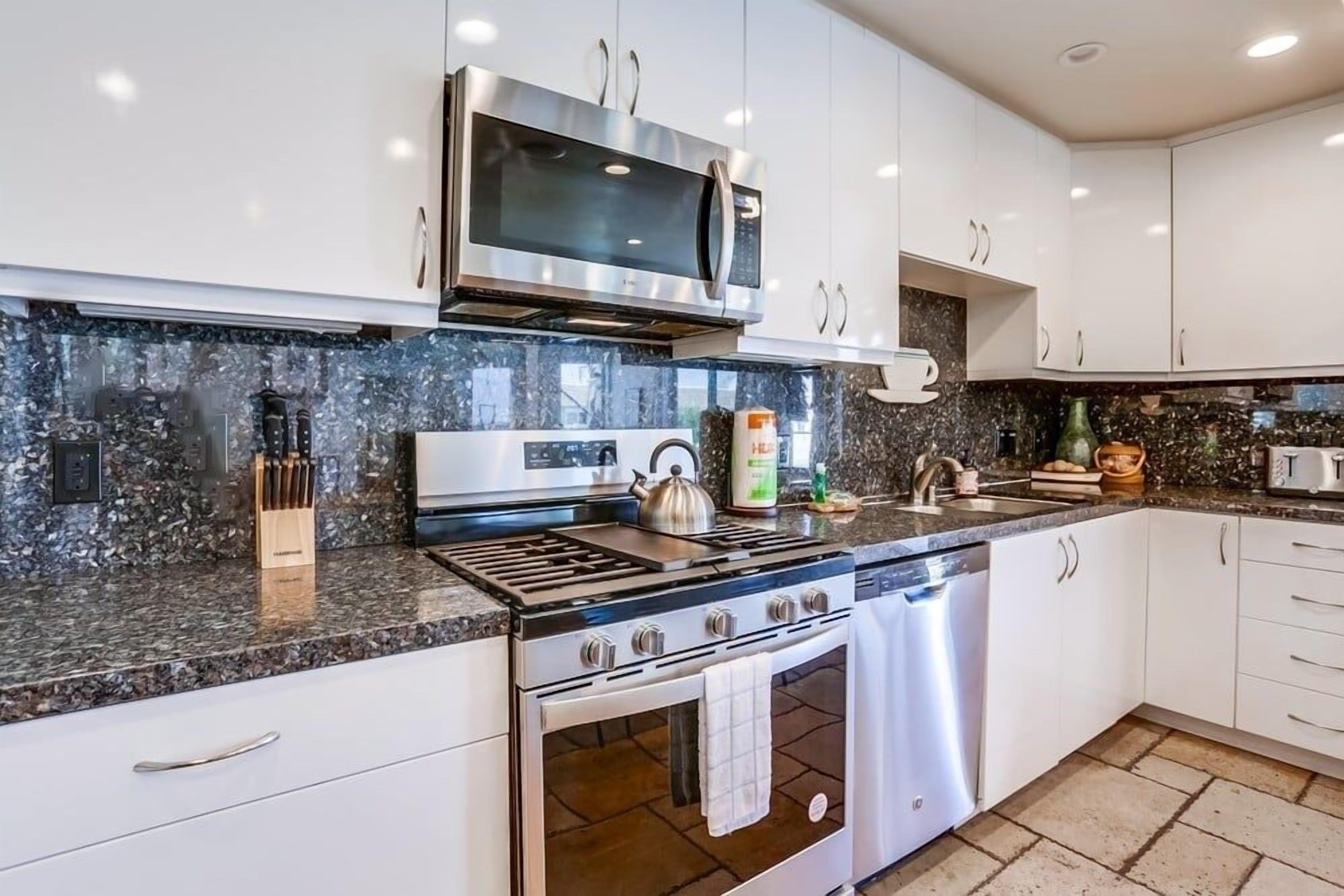Small but very functional kitchen. Gas stove and microwave available for your meal preparation needs.