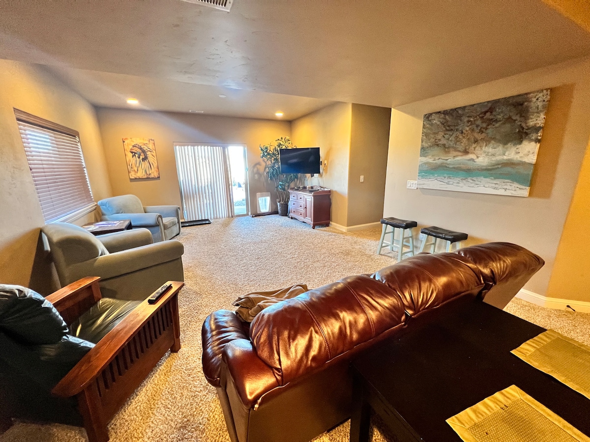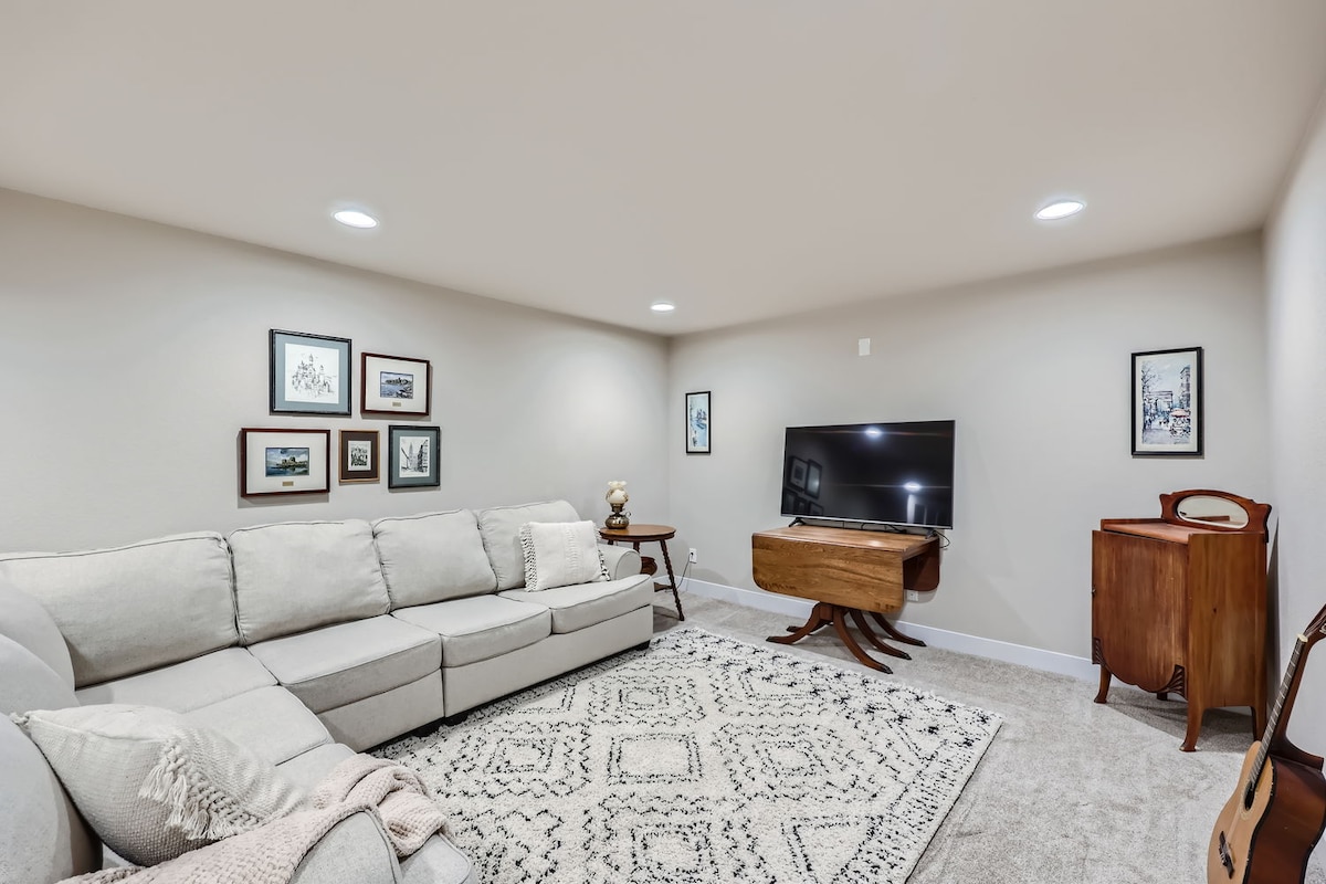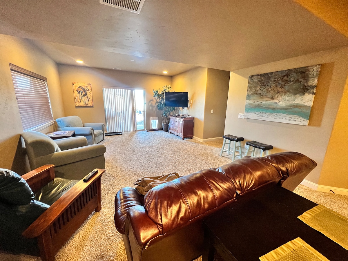 You'll have access to airy and modern shared living spaces featuring comfortable, stylish decor, and all the essentials for a relaxing stay. The atmosphere is warm, relaxed, inviting, and family centered. The living room features a comfy couch, lamps, 3 chairs, and a 52” TV with Apple TV so you can browse and login to your favorite apps like Netflix and Hulu. It is open to the dining area and kitchen.