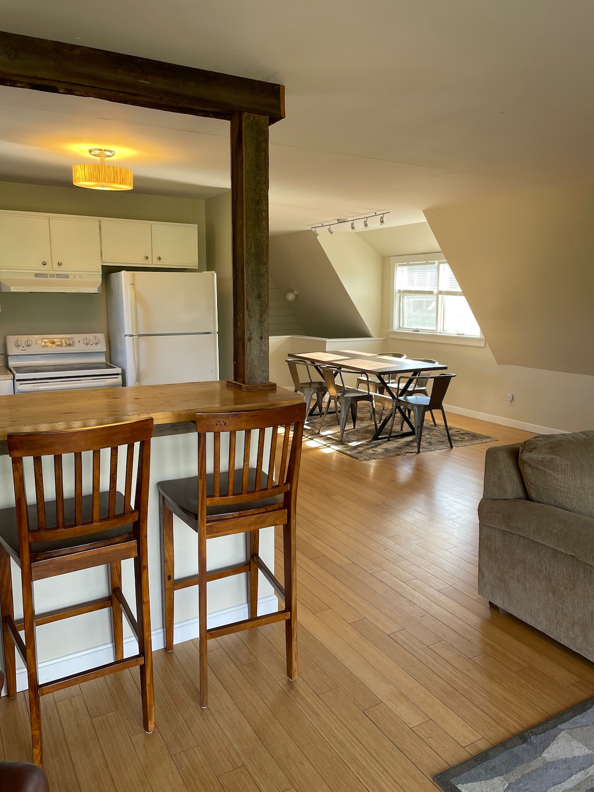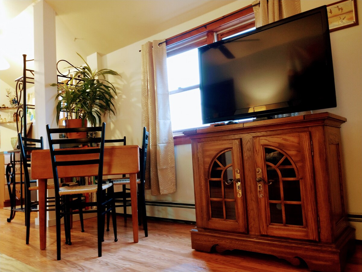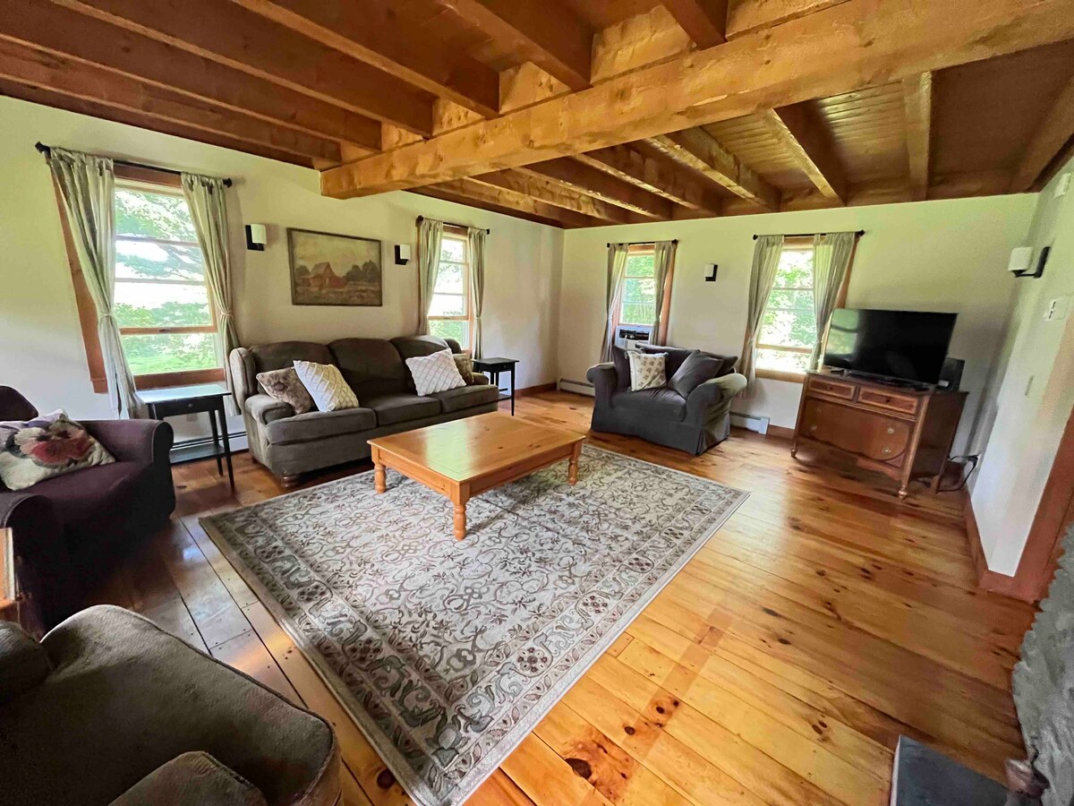 Take it easy at this unique and tranquil getaway. Our apartment is located on a picturesque golf course. We groom miles of trails for cross country skiing snow shoeing and hiking. It is on a nearly 200 acre property. You can cross country ski right out the back door. Close to Stowe Smugglers Notch and Jay Peak. The space is a renovated barn and specifically, the apartment is in a converted hayloft.