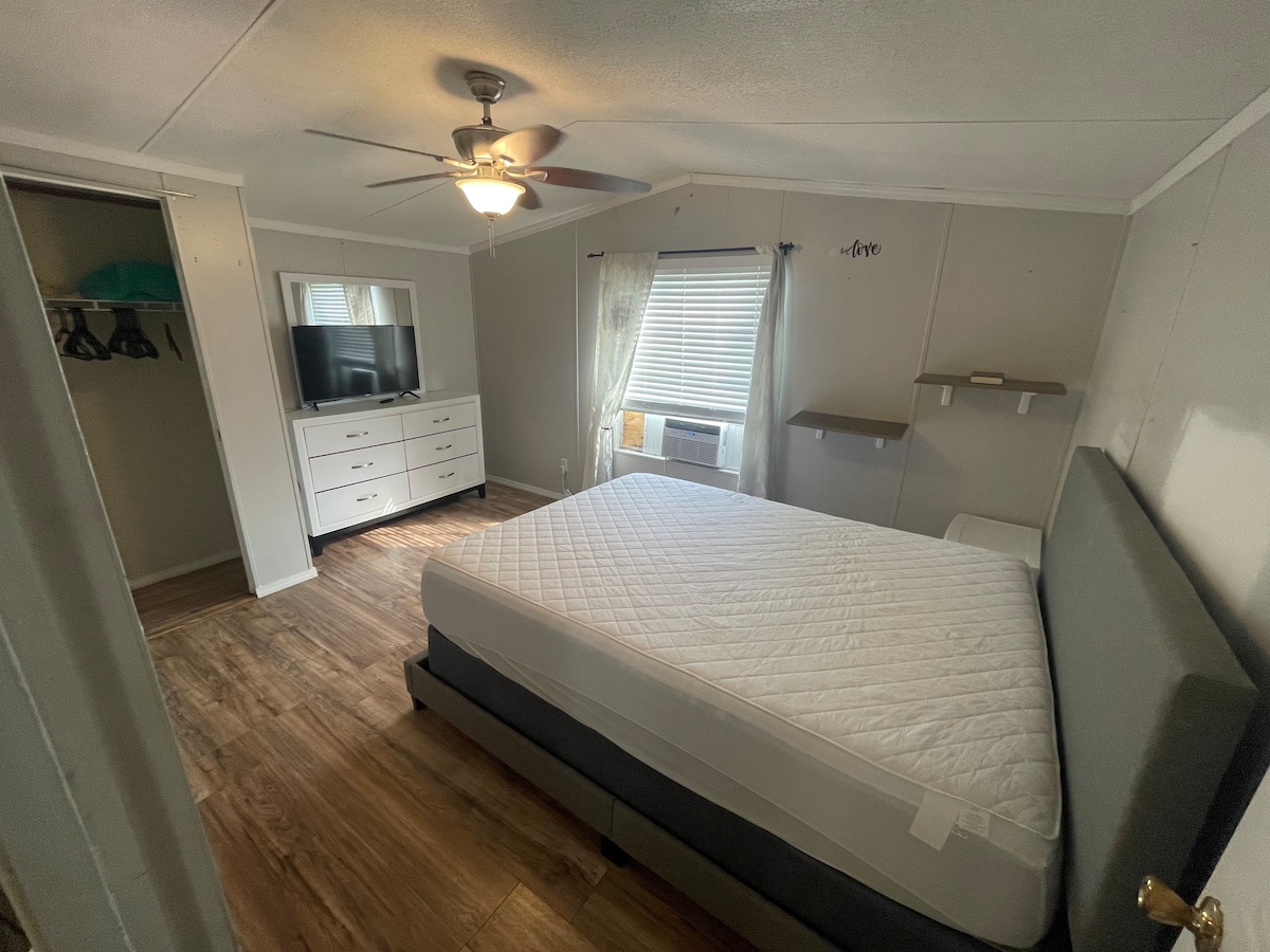 3 bedroom newly renovated manufactured. Master bedroom has 1 queen, Futon and an air mattress. The other bedrooms have two twin beds. There is a shower in the master bedroom and one in the hallway. There is a deck patio with a barbecue grill. There is ample parking space on the property and street for 6 cars. Additional parking in the church lot is available.