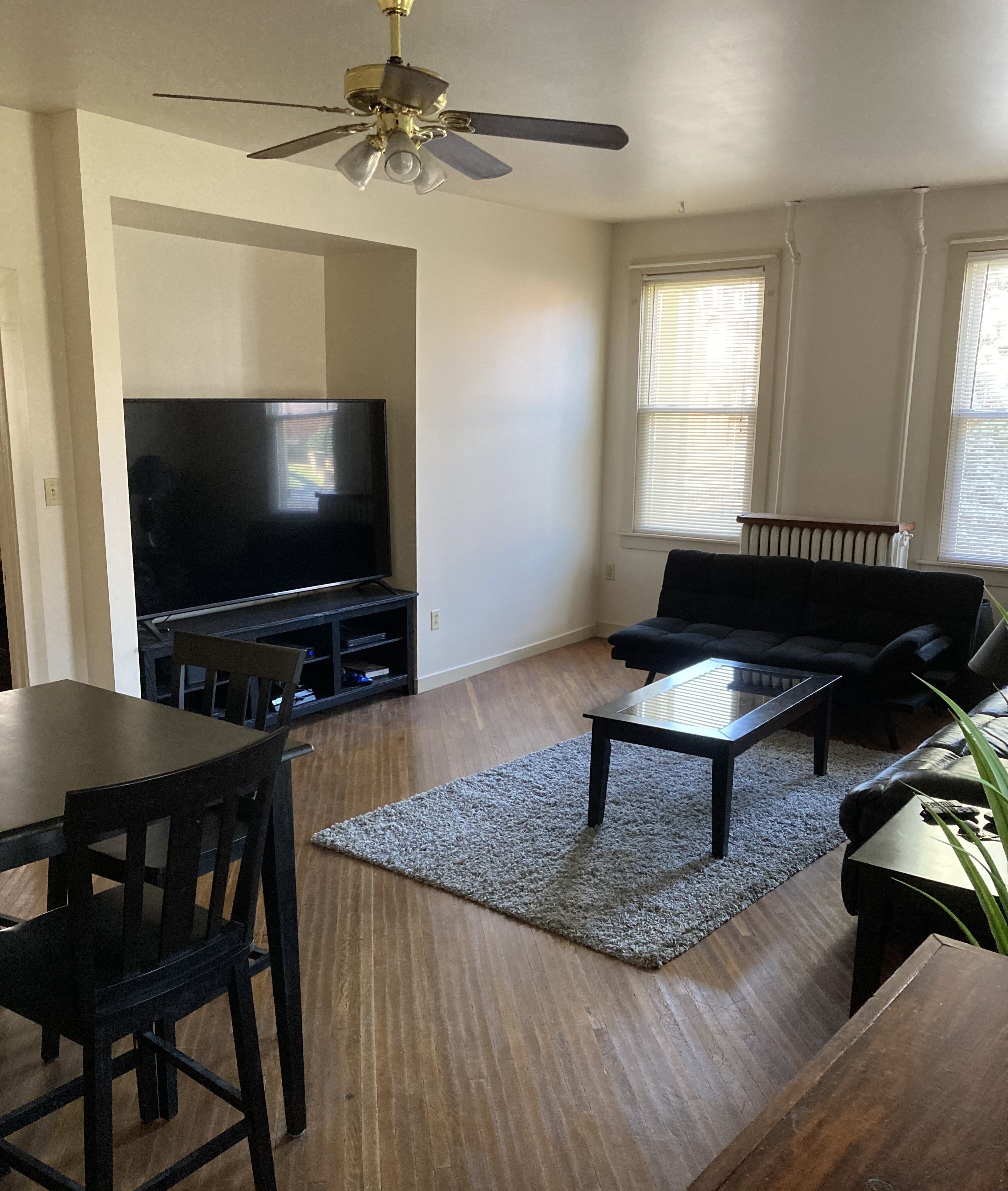 Downstairs is a full size kitchen equipped with the basics. The living room has a couch, loveseat, and TV. There is also a desk for a dedicated workspace, and an A/C and Heating unit with a remote for your comfort. Downstairs also has a full size bath with a shower. Outside is a backyard that is partially fenced in you may use as well.