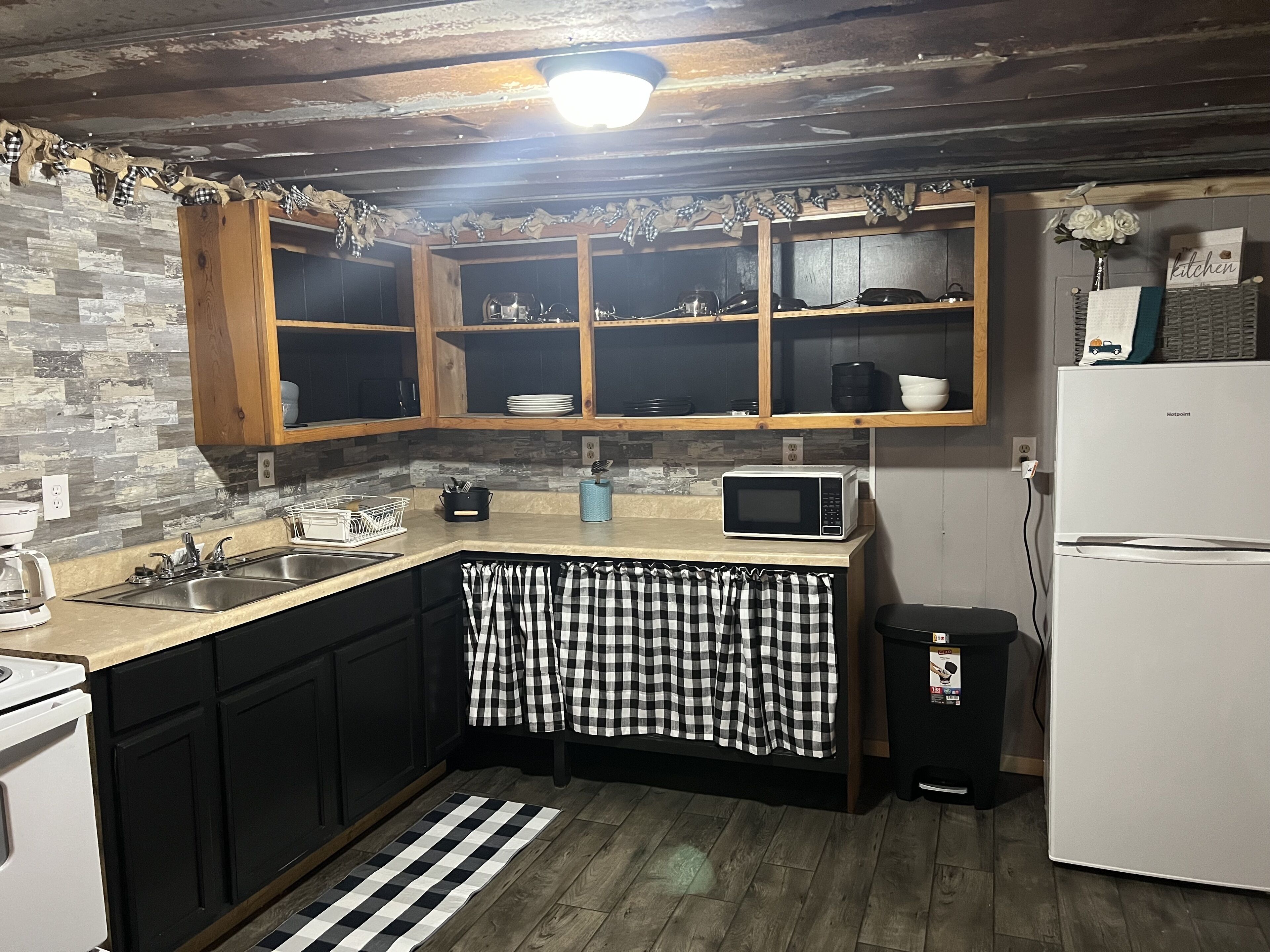 KITCHEN: Fridge, stove, oven, microwave, cooking basics, toaster, coffee maker, dishware/flatware, paper towels/trash bags