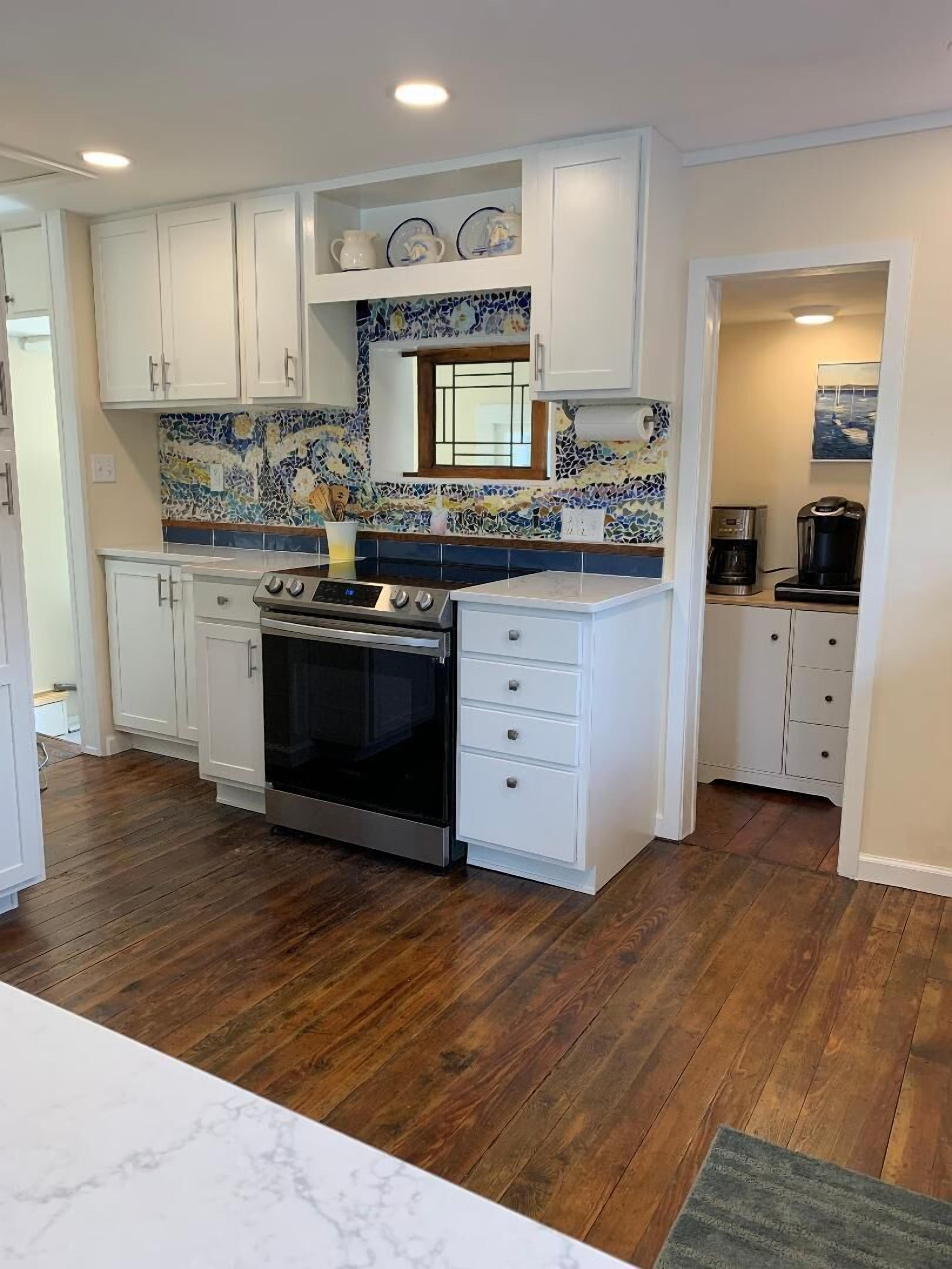 - Kitchen complete with stove, microwave, coffee maker, etc.