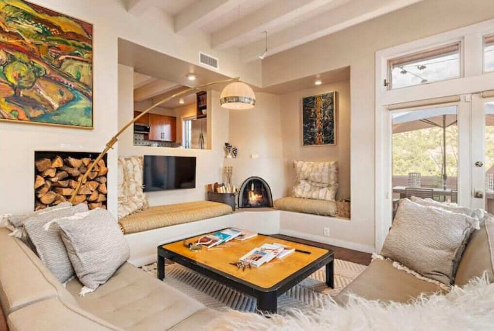 Entering the house into the living room, low slung furniture, natural light, lots of art and another kiva fireplace keep this living space super cozy. There is a small bar with tequila & cointreau to make a welcome margarita (just add fresh limes)