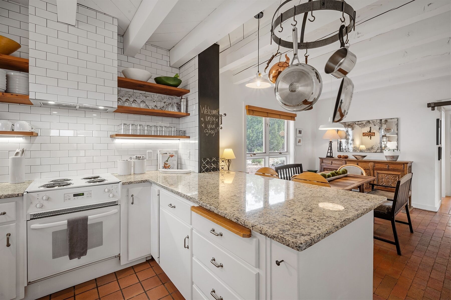 The kitchen has been recently renovated with a rustic elegance. Terra cotta floors, tumbled Italian marble backsplash, a large farm house sink & my Mom & Dad's vintage Time Life series cookbooks create a warm vibe. The kitchen is stocked with everything you could possibly need (or close to it). The list is long but some highlights are: 2 different coffee makers, Vitamix blender, All-Clad pots and pans, immersion blender, mandolin slicer, coffee/spice grinder, Wusthof knives, electric juicer, porcelain platters & serving bowls, cook books, spices & staples. There's a breakfast bar which duos as a kitchen island repurposed from an old 1800's New Mexican farm table.