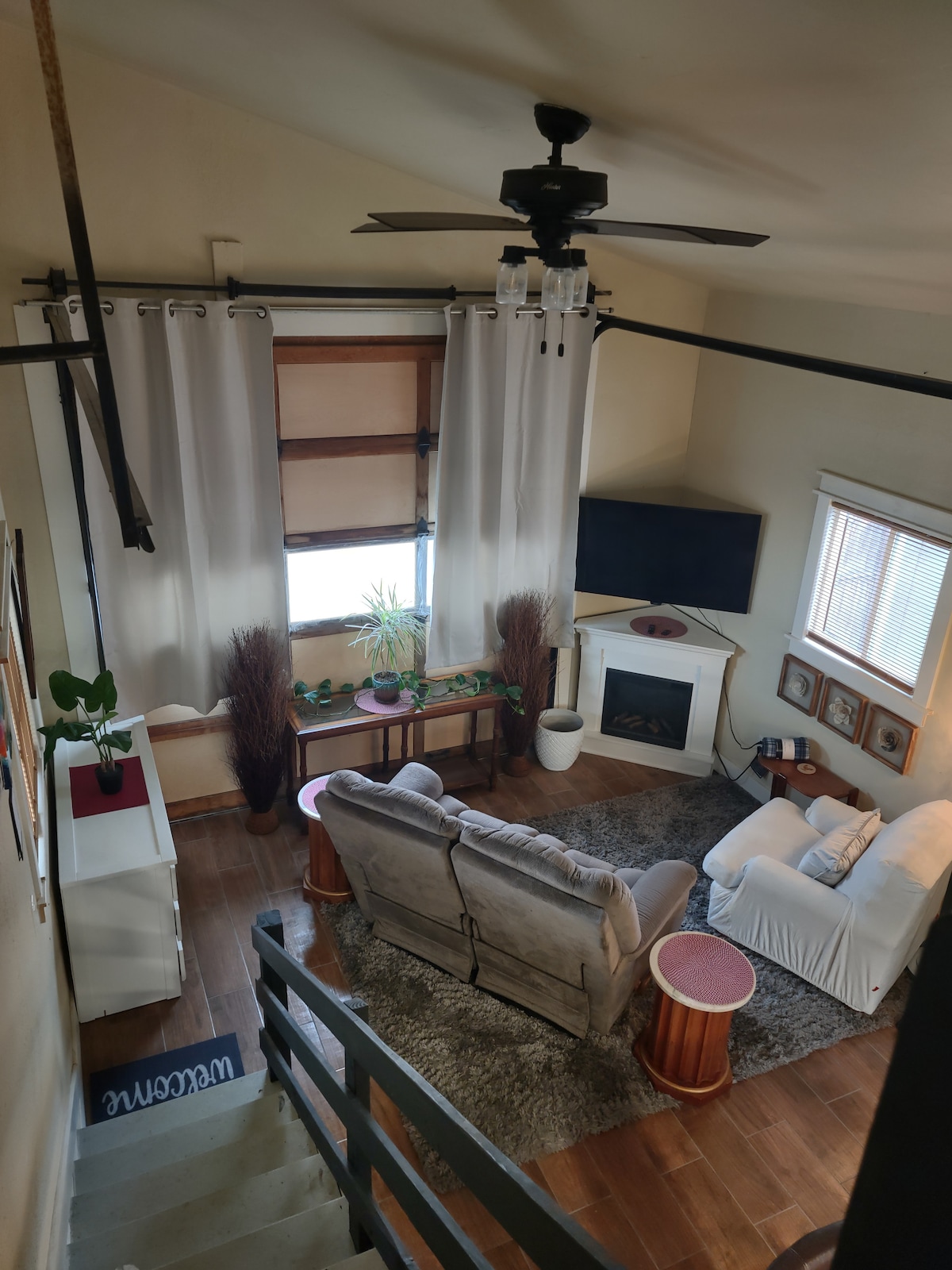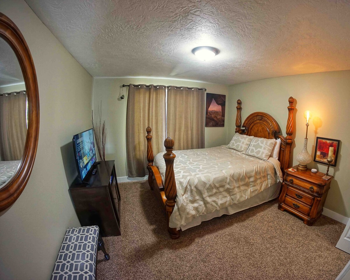 This is a charming upstairs apartment with all new furniture. Blackout curtains in each room with a comfortable chair and queen size bed.