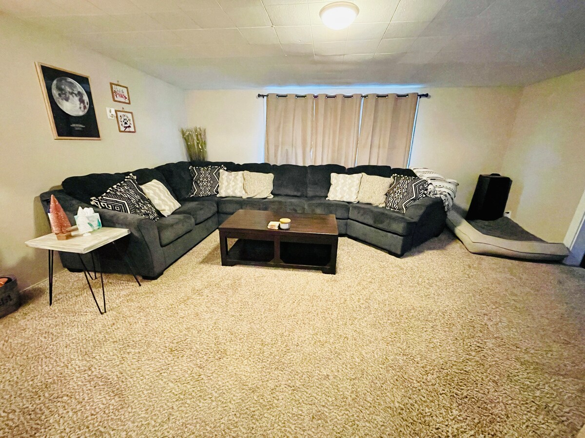 The home is newly and modernly furnished. Lots of natural light from large egress windows make the space feel warm and cozy. The apartment includes two bedrooms, a living area and a small kitchen with washer and dryer.