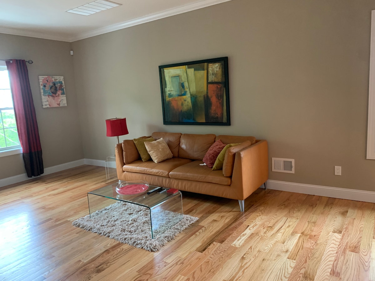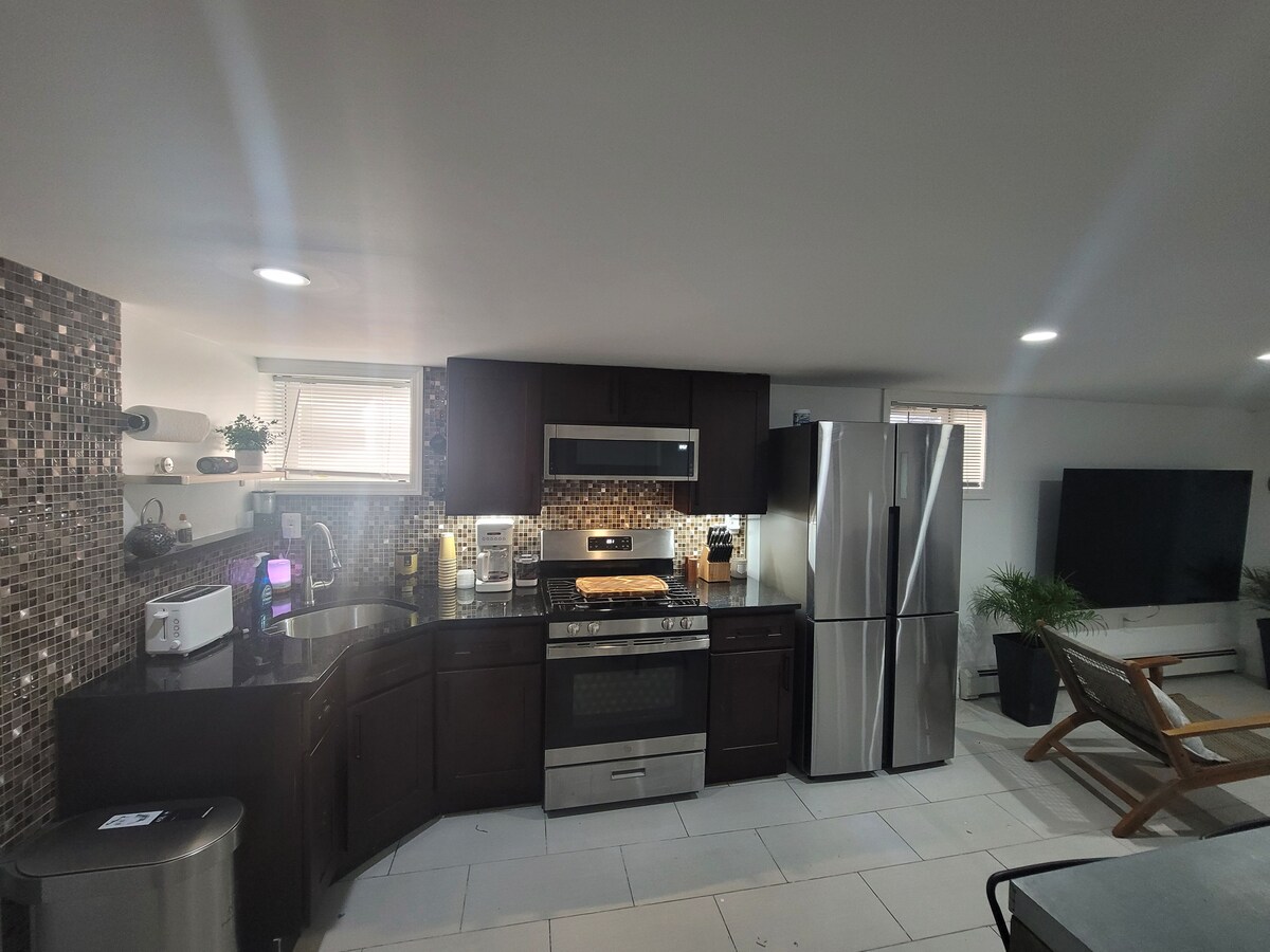Charming two bedroom apartment with it's own separate entrance and PARKING SPOT. This apartment has just undergone a FULL RENOVATION and is BRAND NEW! The first bedroom has a queen size bed. The second bedroom has two single beds. The apartment has an open layout with a modern living room and kitchen. The cozy living room has comfortable seating and a large screen TV. There is a work space with a desk. Fios high speed internet is also included. The Kitchen includes dish-ware, dishwasher, stove, refrigerator, and microwave. There is a modern and elegant dinning area which seats 4. The house has 2 bathrooms! One full bath and one half bath. The apartment is close to the light rail train station. It's only about 30 min away from NYC using transit. By car, its quicker, 20 min drive.