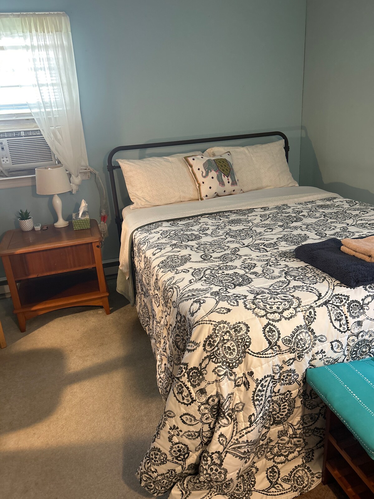 The main level has three bedrooms. The front queen bedroom has a view of the lake from two large sets of windows. This room also has a small private half bath and a wall AC unit. The back queen bedroom has two sets of large windows with a wooded view of mature spruce trees and flowering dogwoods and also a side view of the lake. This room has a Smart TV for streaming and window AC unit. The back middle bedroom has a double bed and a desk. Ceiling fan and portable fan.