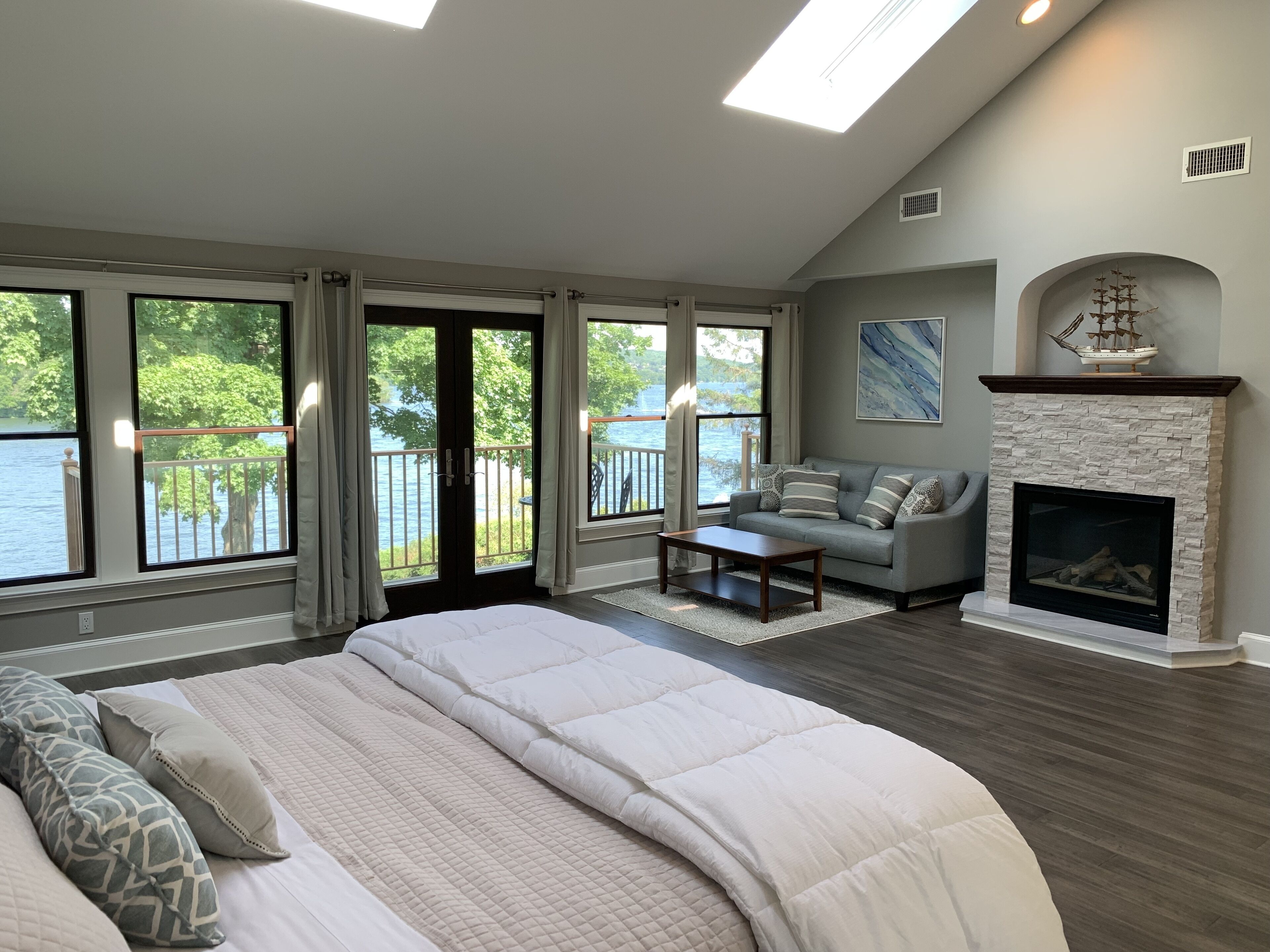 Two bedrooms, each with a king bed comfortably sleep 4 adults. The downstairs bedroom has a cozy sitting area with sleeper sofa (accommodating an additional 2 children), flat screen TV and sliders to the private stone patio overlooking the lake. The upstairs bedroom features a lovely bay window and its own flat screen TV. Each bedroom has an adjacent tile bath fully stocked with towels and toiletries.