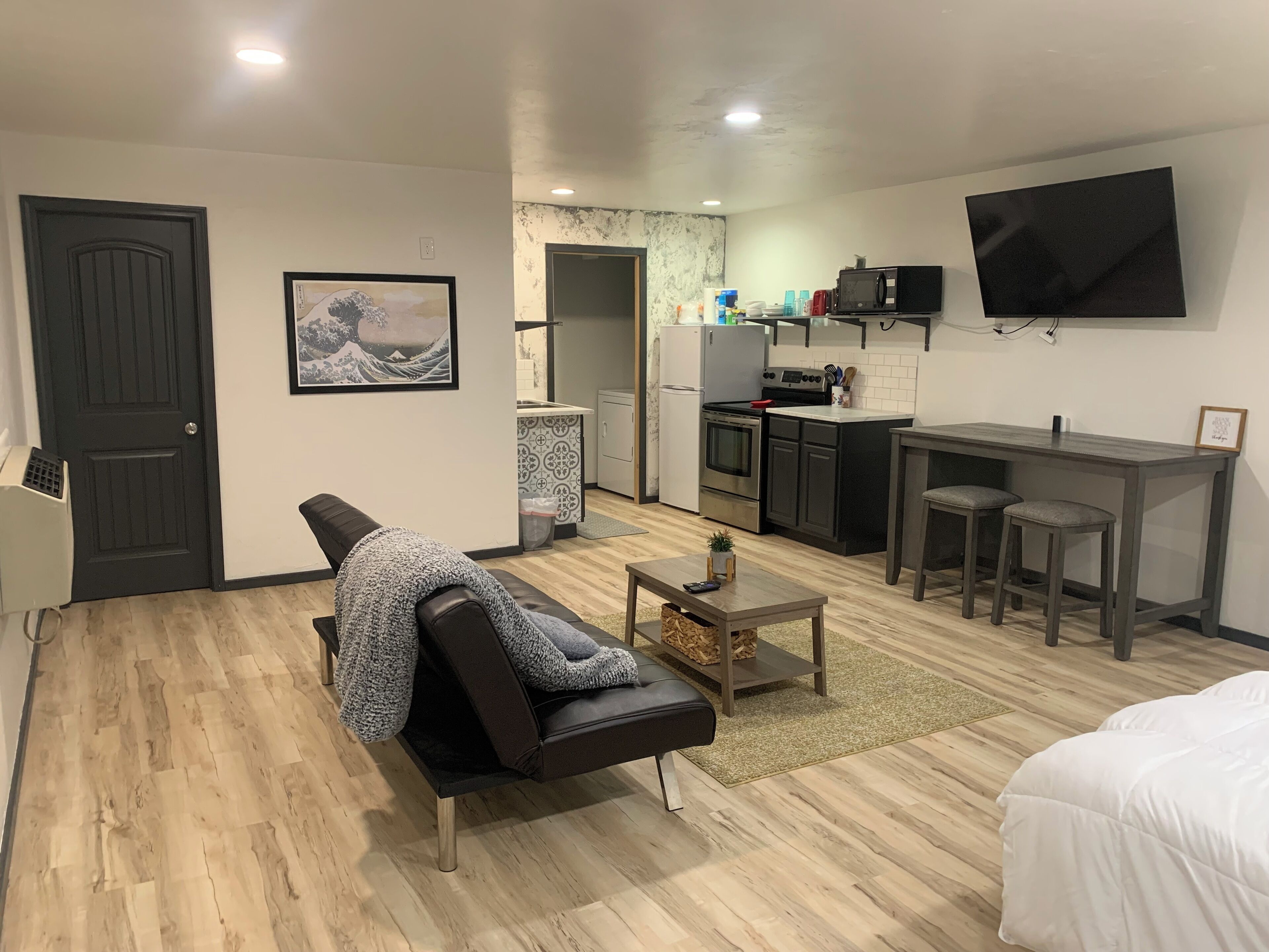 Cozy studio barn dominium apartment, with all the amenities. Traveling for work? This apartment is what your are looking for. Has small kitchen with stove and small laundry room with washer and dryer. The kitchen is stocked with dishes, cooking utensils, coffee maker, refrigerator, stove, oven, toaster and microwave oven.