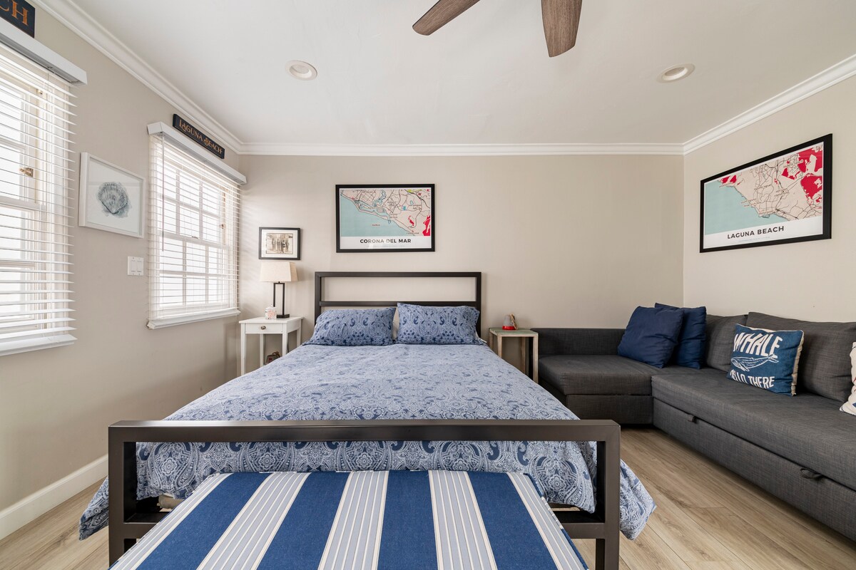 This spacious studio is located a few blocks from Corona del Mar beach and is walking distance to many restaurants, shops, a grocery store and a drug store.