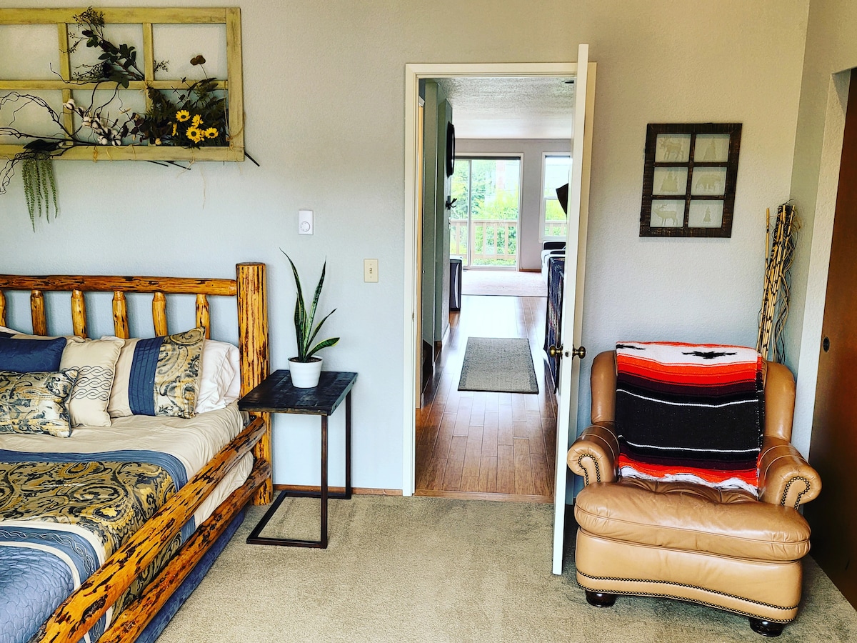 Queen size bed, master bath, work area, fireplace, full Kitchenette, TV- with Wifi so you can watch your favorite shows and movies!