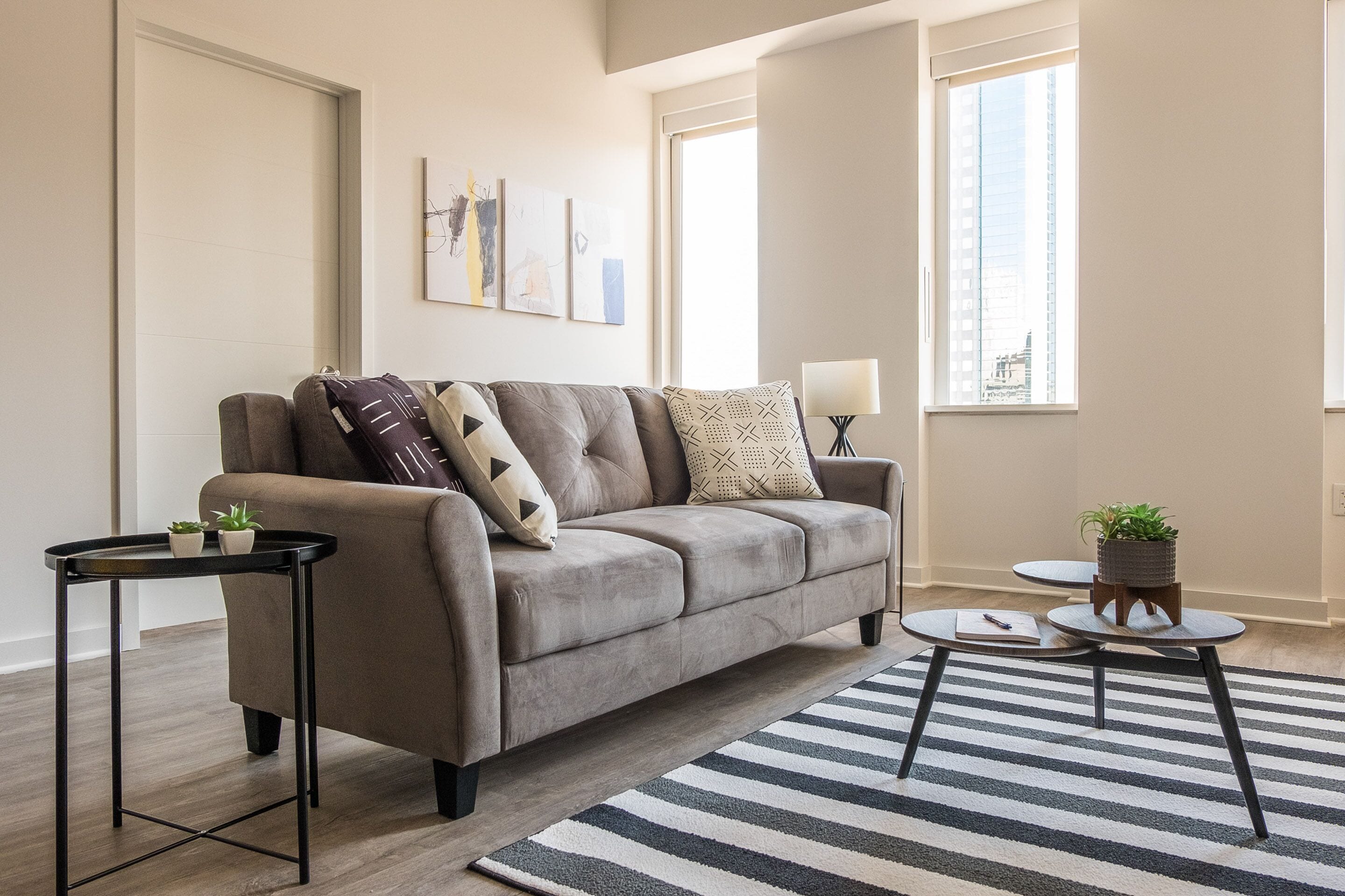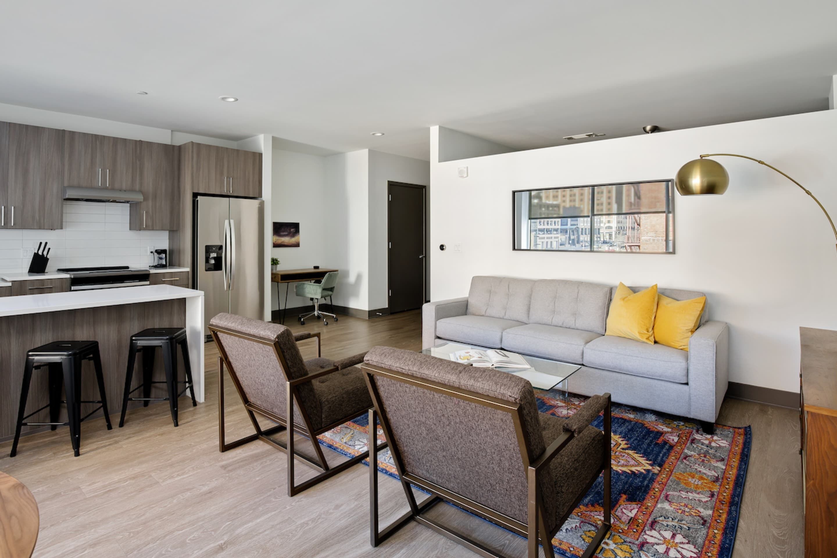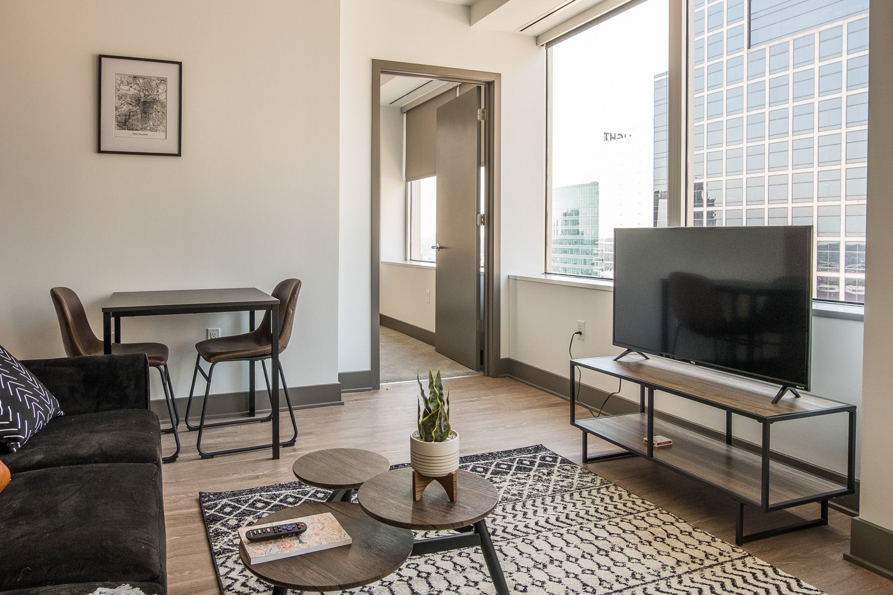 - "Nice apartment. Cimfortable bed. Furnishings were on the cheap sude, but nice stay" - "Beautiful property, very clean, washer dryer, fitness center, even a free coffee center downstairs. Seriously, everything you need. A walkable location, some sketchy characters out and about, but you are downtown. Building is very quiet though with keyed doors and elevators. We always felt safe. Would return to this property if we were to ever come back."