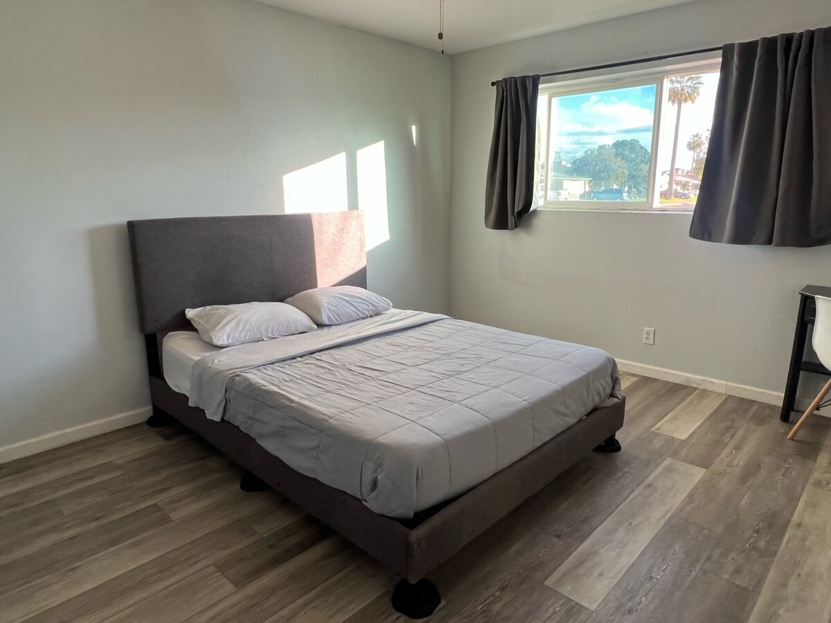 This is a stylish queen size private bedroom with closet area and a working desk, you will have your own exterior entrance through the backyard directly to your room.