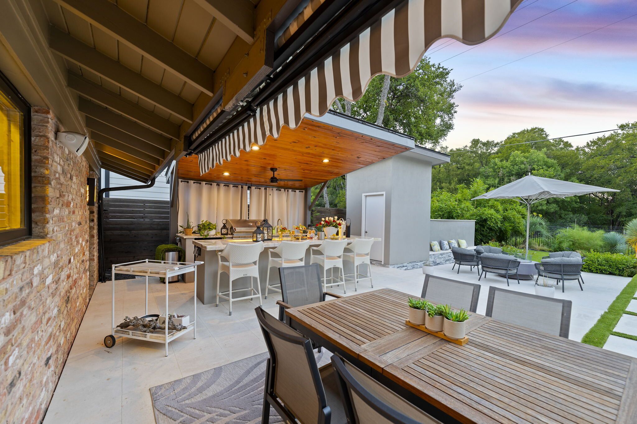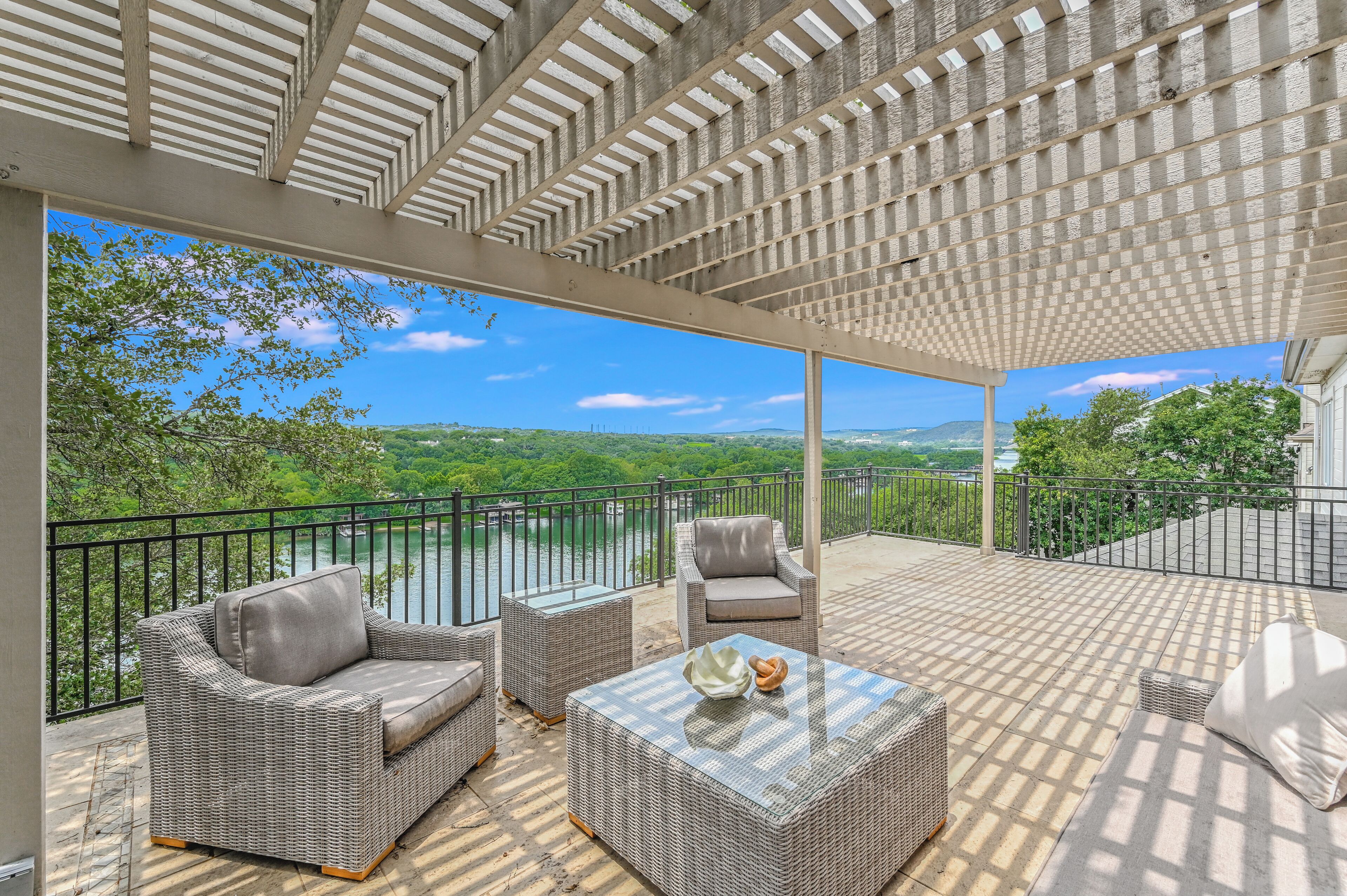 The ABOVE Overlook Estate features 3 living areas, 2 dining areas, game room, 5 bedrooms (bunk room!) and a guest apartment with a kitchenette and lounge. The property has been professionally decorated with modern finishes, and is fully stocked. The pool is enclosed in the front courtyard and surrounded by native trees. The guest apartment allows for some of your group to have a little more quiet as it is detached from the main house. With multiple balconies and outdoor sitting areas, you are never far from that clifftop view over Lake Austin- perfectly suited to enjoy the Austin sunsets. This property is regularly set for 16 guests, but, with homeowner approval, can host as many as 18 guests with luxury Frontgate beds which would also be set with ABOVE standard luxury linens. Additional fees may apply. All guests must be pre-approved to rent this estate. A full guest list will be required. Boat slip and/or boat tie-up may be available by approval and with a fee.