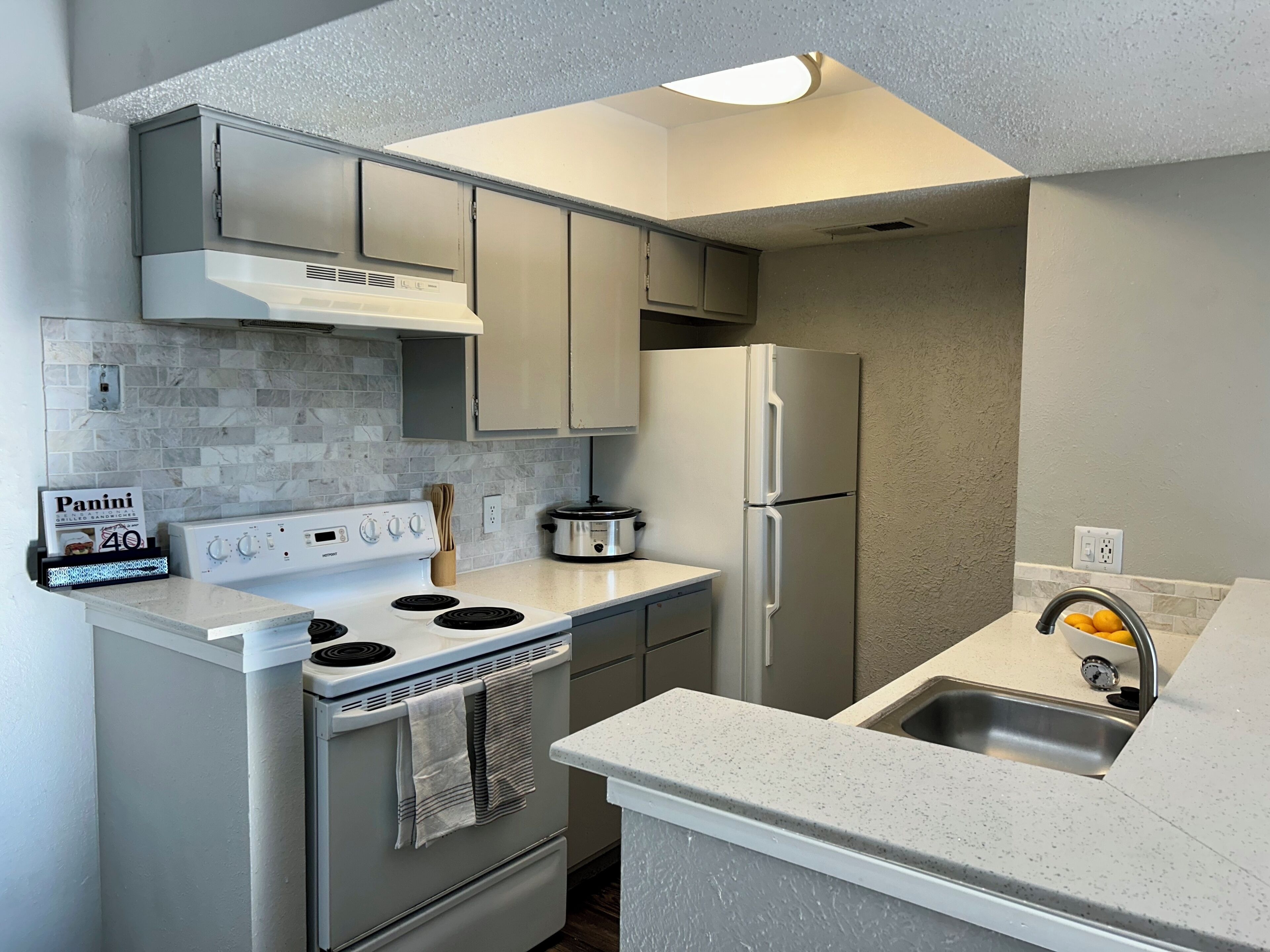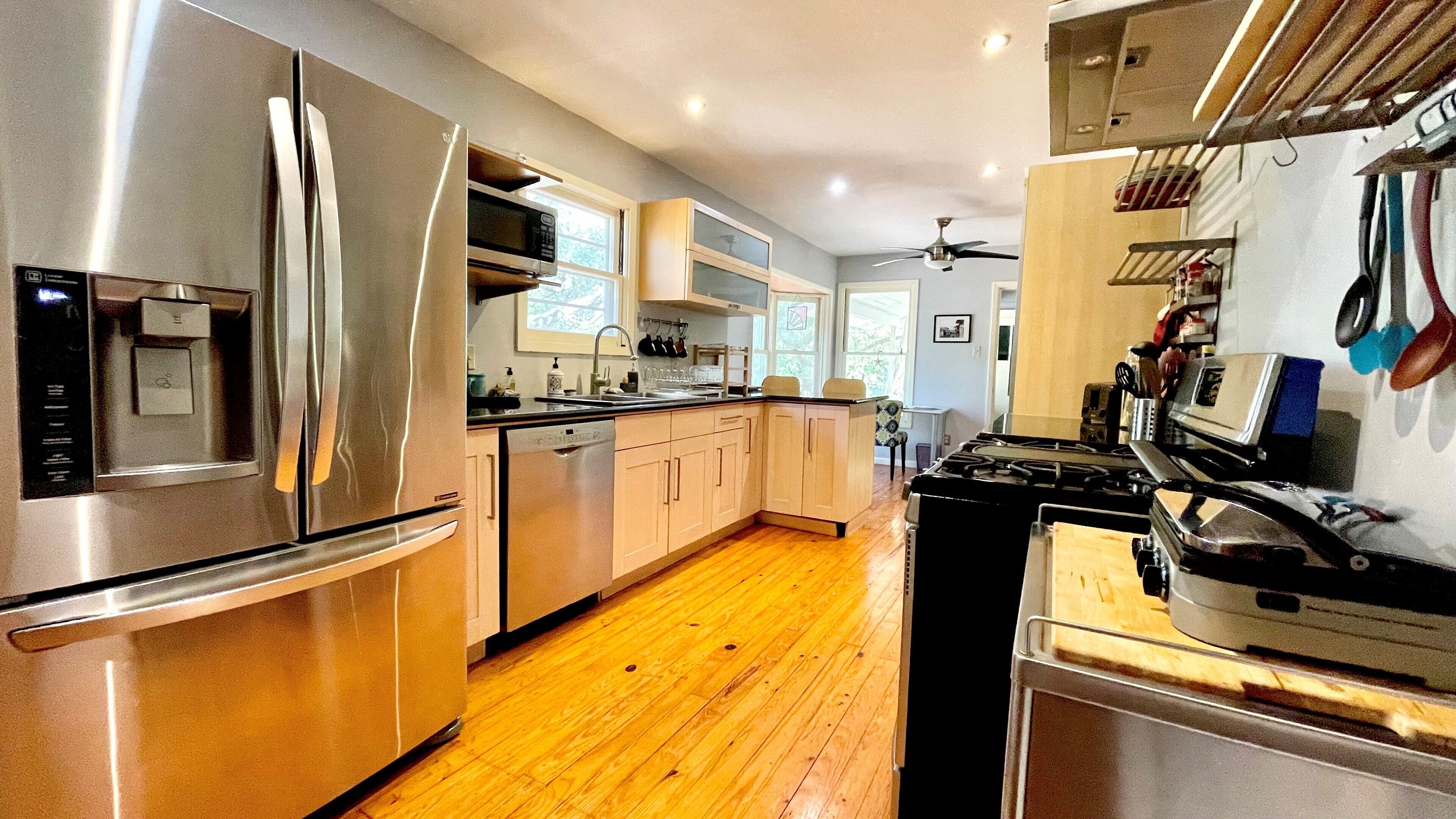 The area has many great restaurants, but when you want to cook in, we provide a full kitchen with all the necessary utensils, pans, and mixers. The kitchen includes a filtered water dispenser.