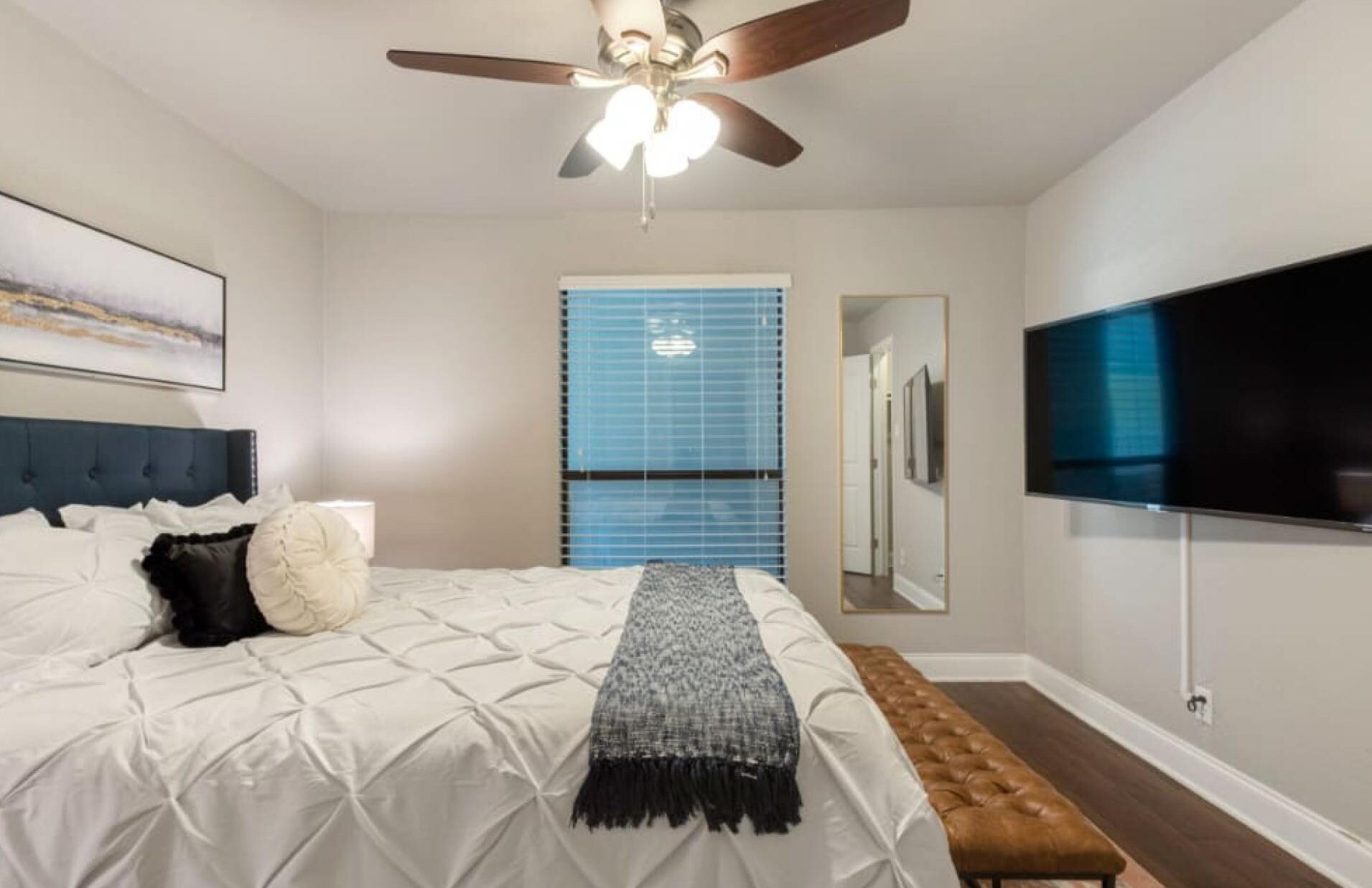 The primary bedroom offers a queen-size bed, a huge closet, a flat-screen TV with Apple TV, full-length mirror, an upholstered bench and great morning light.