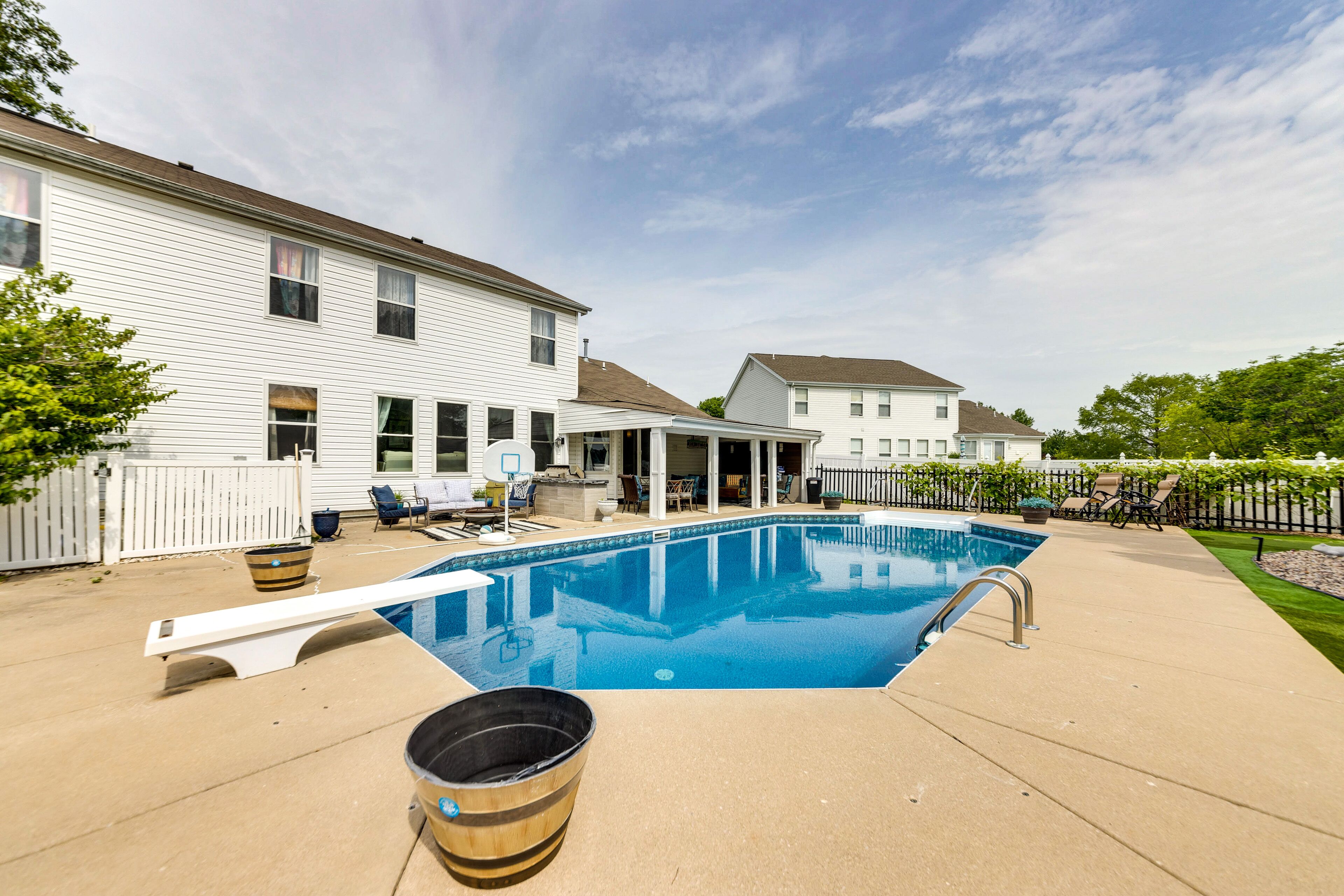 - Backyard: Private fully fenced-in yard with a patio, fire pit and outdoor seating.