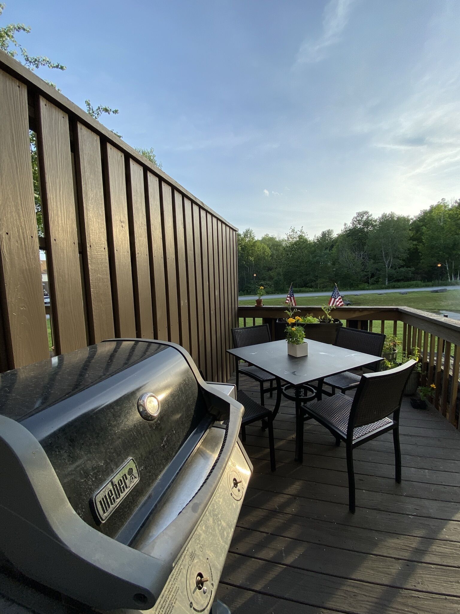 One door off the main living space opens to a wrap-around deck with outdoor seating, as well as a gas grill; the other door opens to a small, screened in porch with a picnic table.