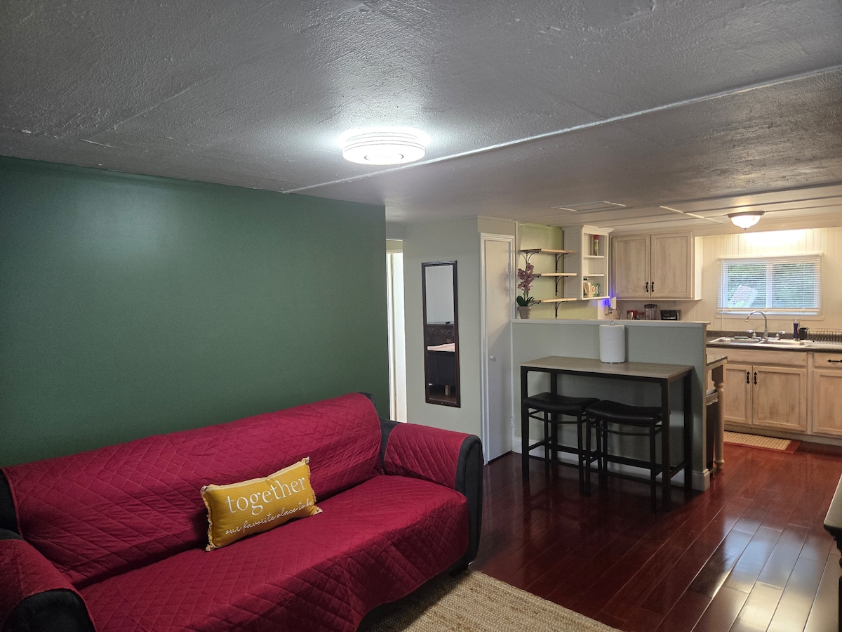-Modern common space with a full-size Murphey bed (linens provided-Guest will be responsible for placing these on the Murphey bed)