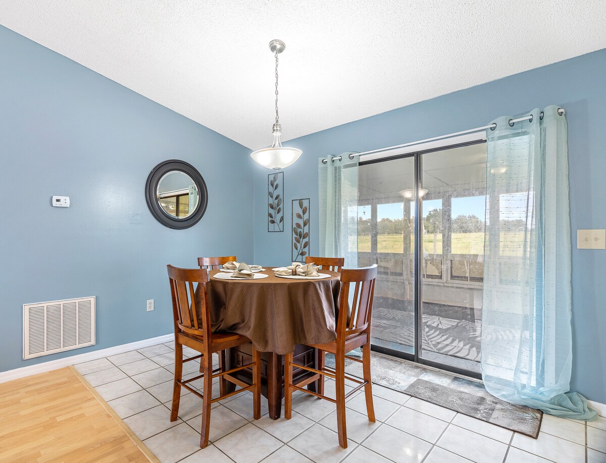 This home is conveniently located in a cul-de-sac with a pasture behind it for a relaxing low traffic area. Back patio is screened and you can enjoy coffee with the cows that come up to the fence occaisonally. Centrally located between Jacksonville, Tampa and Orlando. Our new World Equestrian Center (WEC) is only 30 minutes away. We have many local State Parks and Springs nearby as well as Silver Springs State Park. Near shopping, restaurants and medical. Close to each coast of Florida.