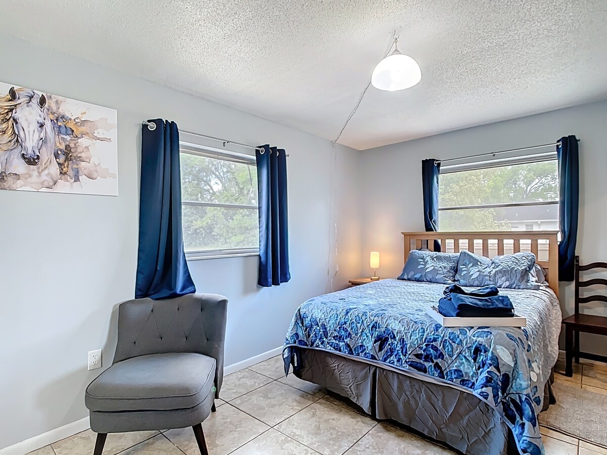 Whether for work or play, you have found the perfect place to stay! If your requested dates are not available in The Downtown Retreat One, please send an inquiry as we have several Retreats available within the same complex and may still be able to accommodate your requested dates. The Downtown Retreat One is conveniently located in the heart of Ocala, just 0.7 miles from Advent Health and HCA Florida Hospitals, and 1.6 miles from the Historic Downtown Ocala Square for local fare, entertainment and nightlife. This newly renovated peaceful two-bedroom one bath Retreat is one of six Retreats located in a very quiet and private vacation complex owned by Ocala Marion Vacation Rentals.