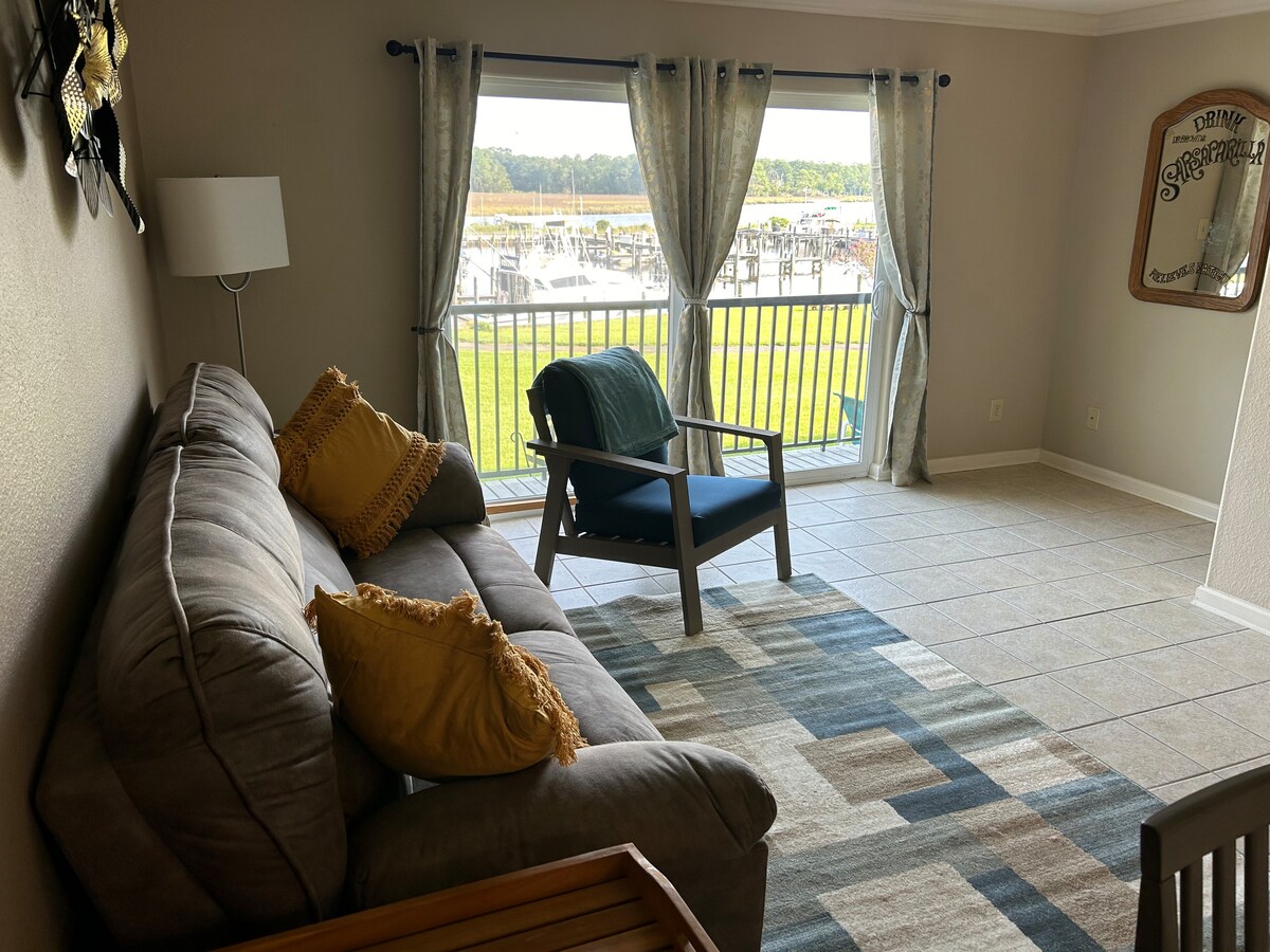 Beautiful 2 bedroom 1.5 bathroom condo with river view. When you walk in you will be greeted with a stylish dining room and full kitchen. All bedrooms are on the 2nd floor with a queen size bed, TV and dresser. The first floor will consists of kitchen, a half bath, and living area that leads to the back deck. The second floor will have two bedrooms and one bathroom. Master bedroom leads to the deck over looking the river. You will love this spacious and serene space. Access to club amenities.