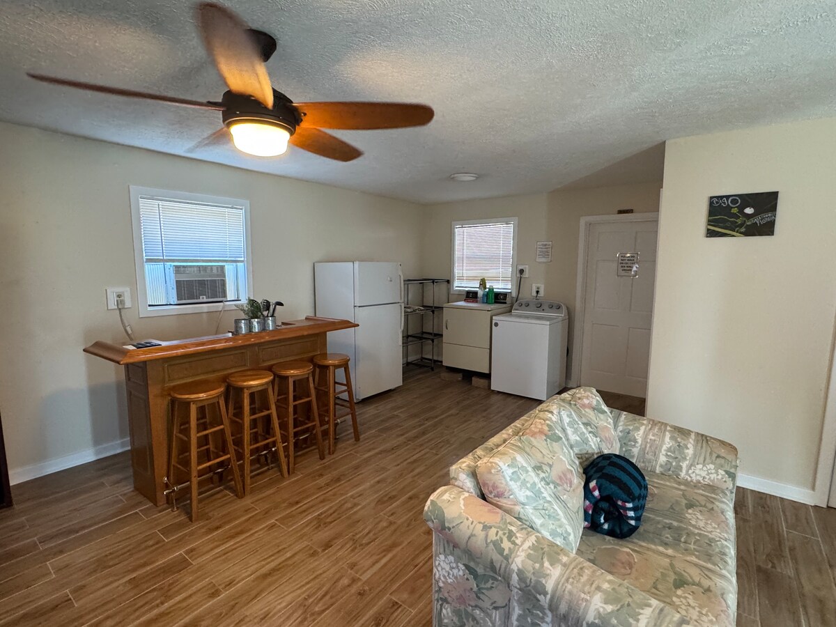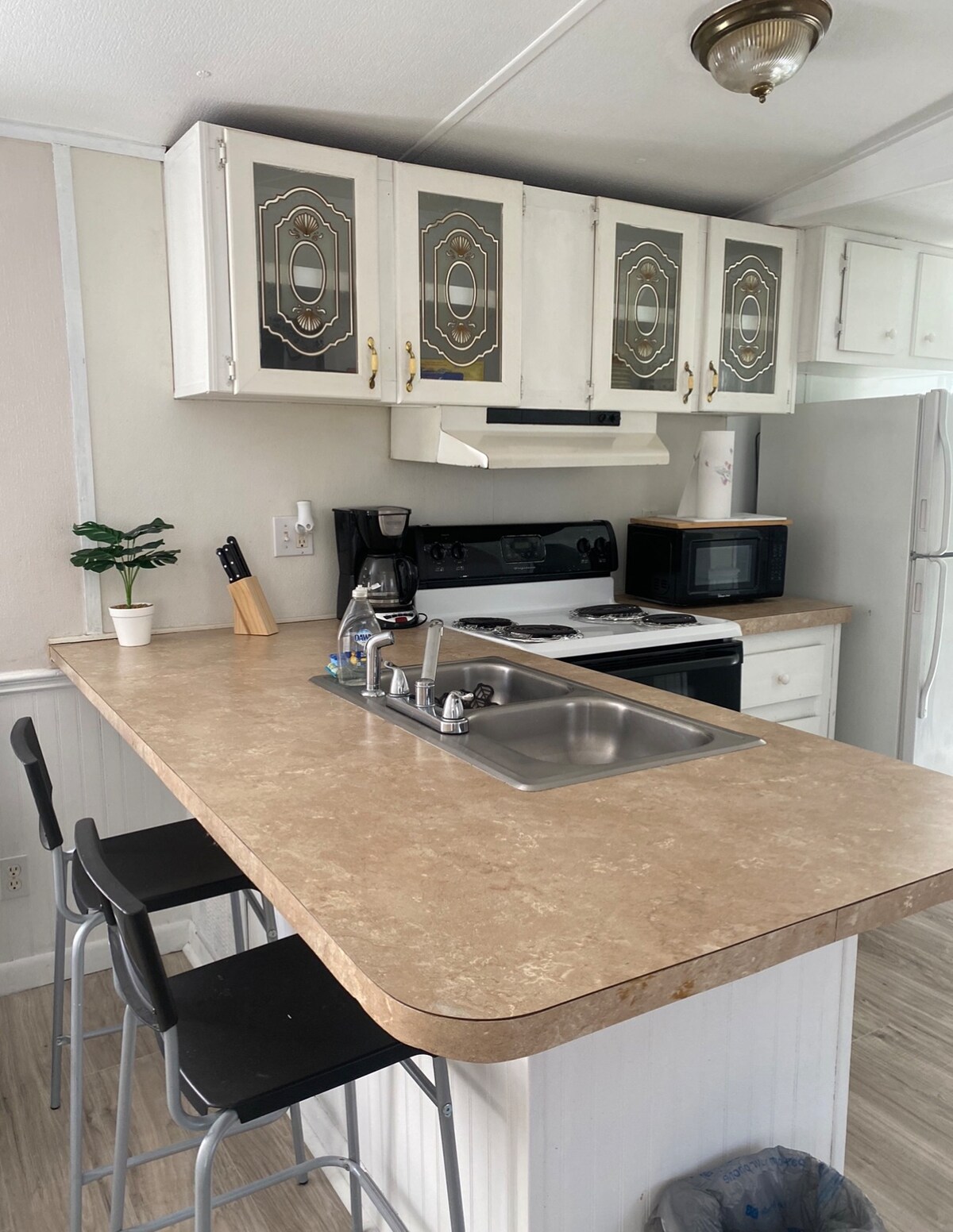 KITCHEN: Dishwasher, stove/oven, refrigerator, microwave, dishware + flatware, cooking basics, trash bags + paper towels, breakfast bar