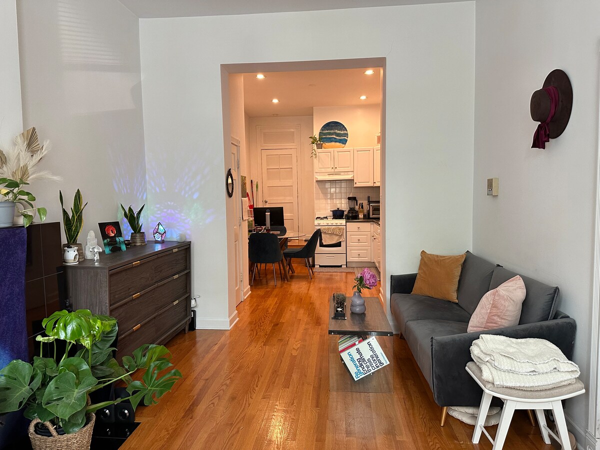 Our garden apartment is located 6 steps down from street level. Living room has 10 foot ceilings and bedroom has windows that allow in sunlight.