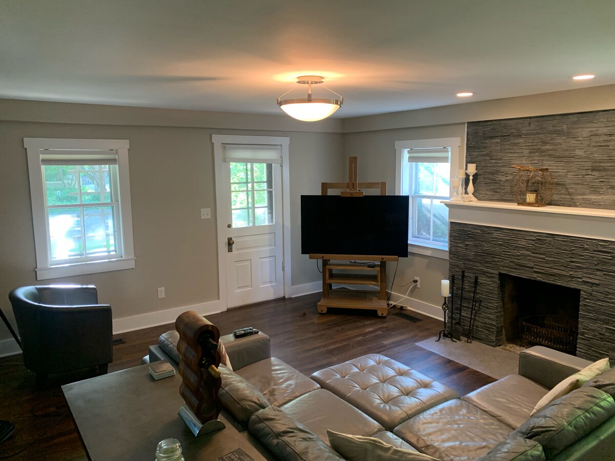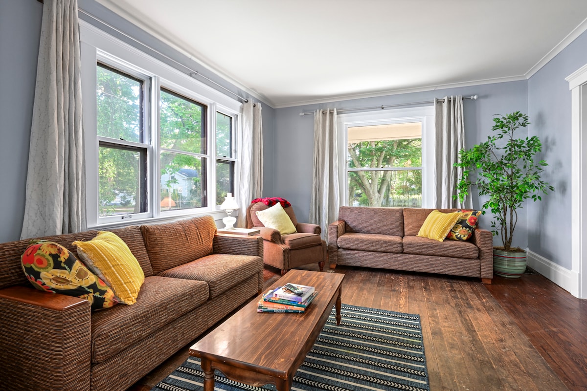 Our 100 year old home is welcoming, warm, charming, and quirky. We have beautiful hardwood floors throughout the house, and the snaps and pops that old floors have. The living room is furnished with a sofa, chair and tables. The dining room table seats 6. The kitchen is well-stocked with dishes, pots, and pans, and a dishwasher. We have a Roku and display, and wireless internet is available. The house has been recently upgraded with central air conditioning and a new furnace.