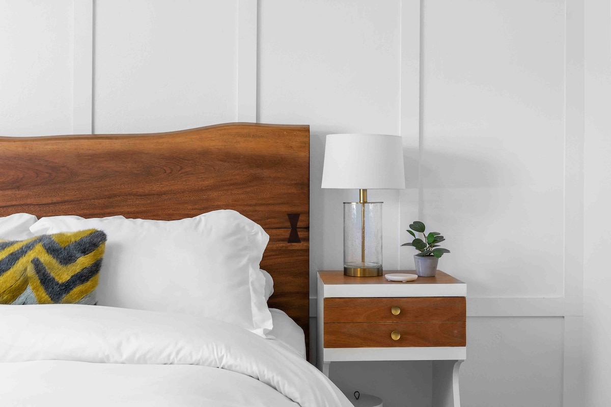 ✔144 sq. ft. cozy bedroom with a upholstered Cal king-size bed with memory foam mattress, bedside tables & lights with USB.