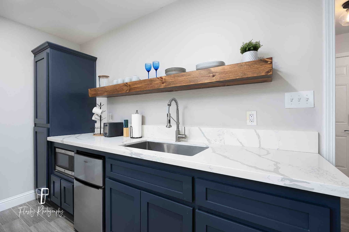 ✔Kitchen (90 sq. ft.) is equipped with a microwave, cooking stove, Brita Water Pitcher in the brand-new refrigerator, and essentials such as coffee maker, pot, pan, utensils, and condiments.