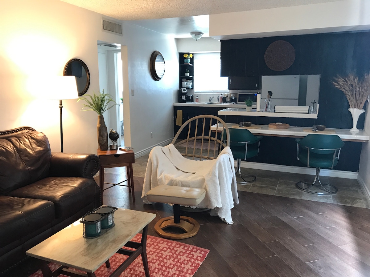 A private unit for long-term vacationers and professionals near downtown, businesses, and hospitals. Relax in this spacious 1-bedroom 1 bathroom unit on the 1st floor in a grand building. Sleeps up to 4 guests with a queen, a floor mattress (upon request), and couch (extra fee $25 per night after 2nd guest). A 65" HDTV with Prime Video and YouTube TV, a refrigerator, microwave, cooking tools, window ACs, portable heaters, washer and dryer. No party is allowed. No pets are invited.