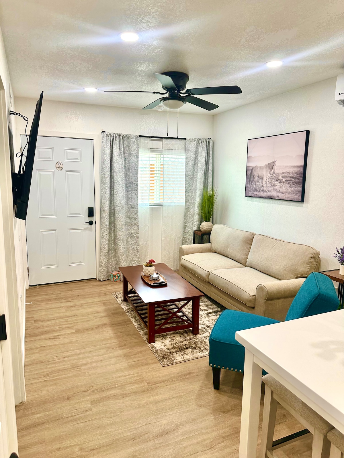 ✔Relaxing living room (210 sq. ft.) with wall-mounted 65" widescreen voice remote Fire TV with Amazon Prime Video and YouTube TV, sofa, reading light, coffee table.